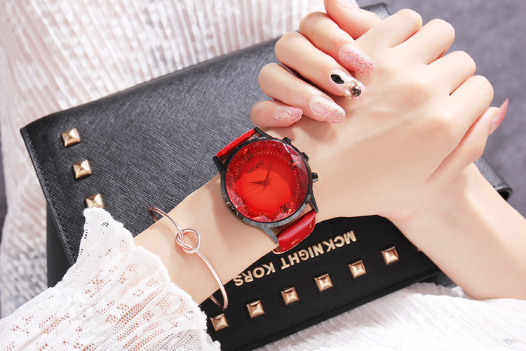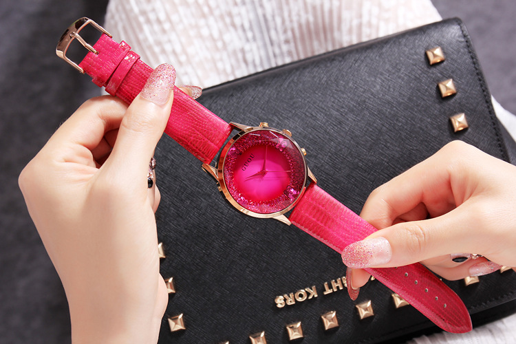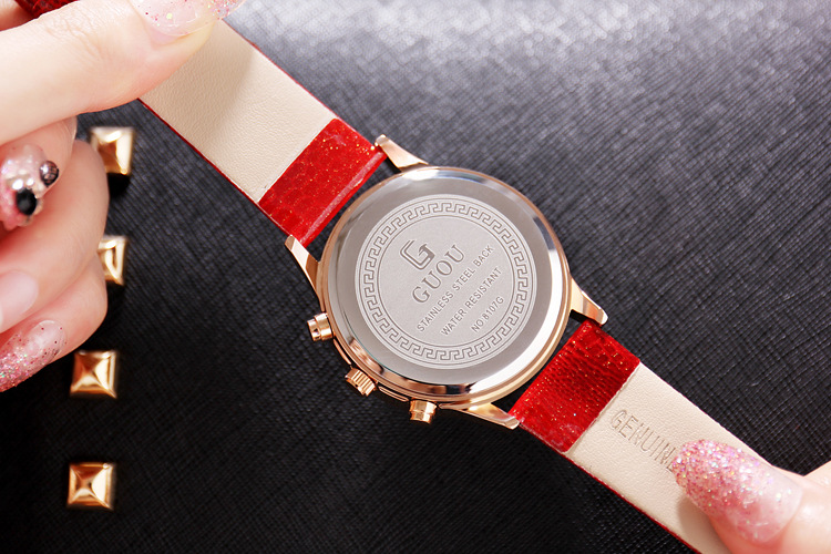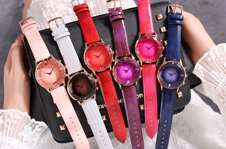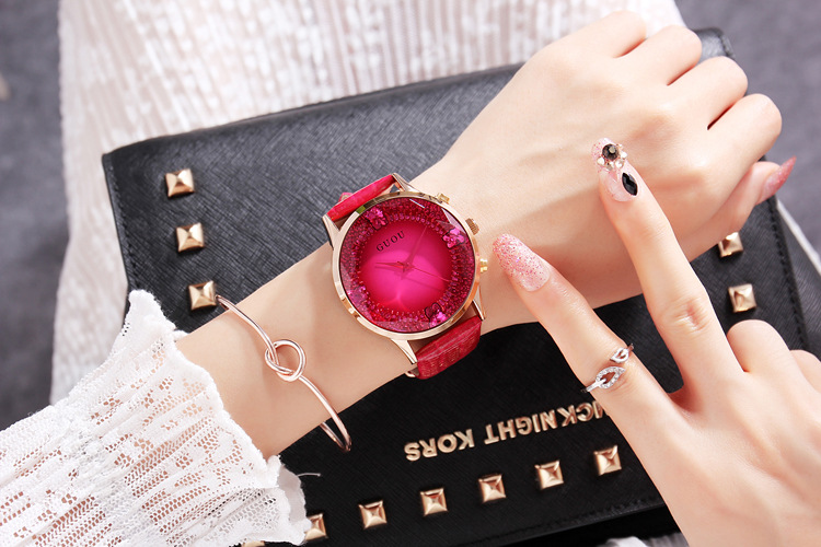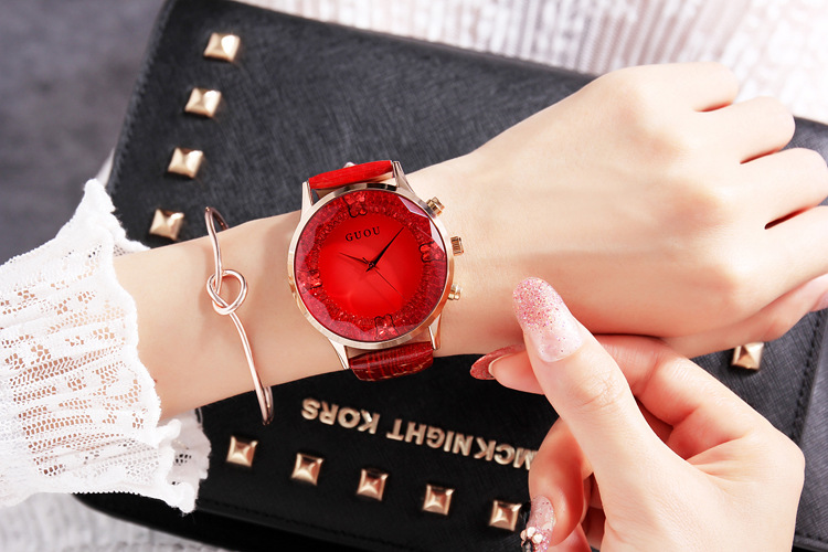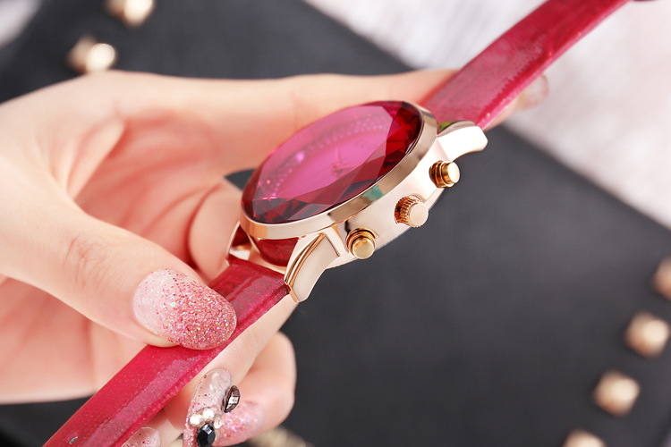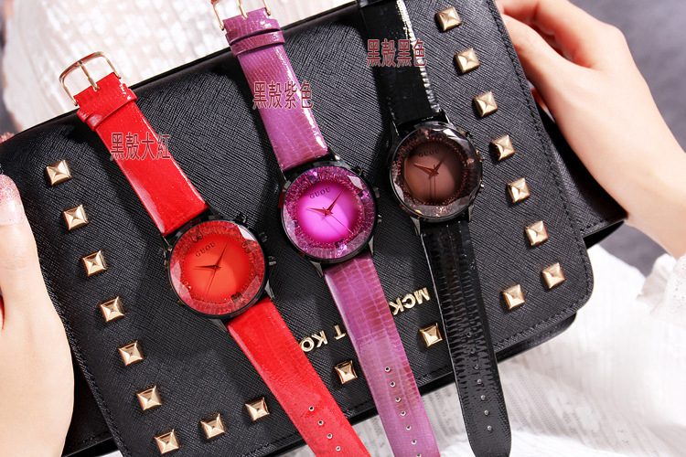 耐用大牌奢華時尚帥氣大錶盤水鑽表紅色紫色皮錶帶女士手錶Wat49