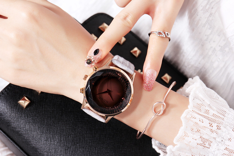 新款 女士時來運轉腕表玫瑰金 雕花殼 皮錶帶 時尚女手錶Wat50
