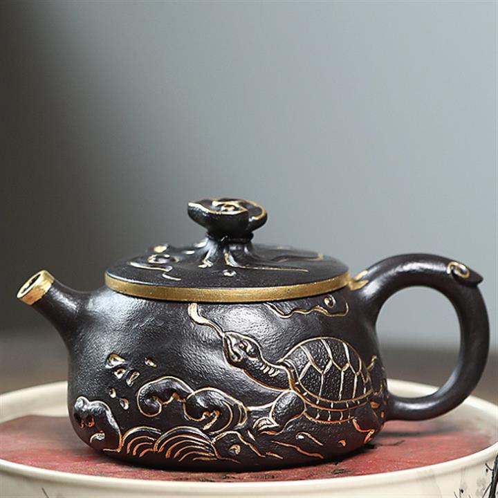朱泥捂灰金龜換酒手工描金紫砂壺POT6500