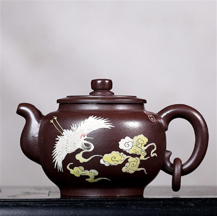 原礦紫泥手工泥繪雲鶴呈瑞紫砂壺POT6526