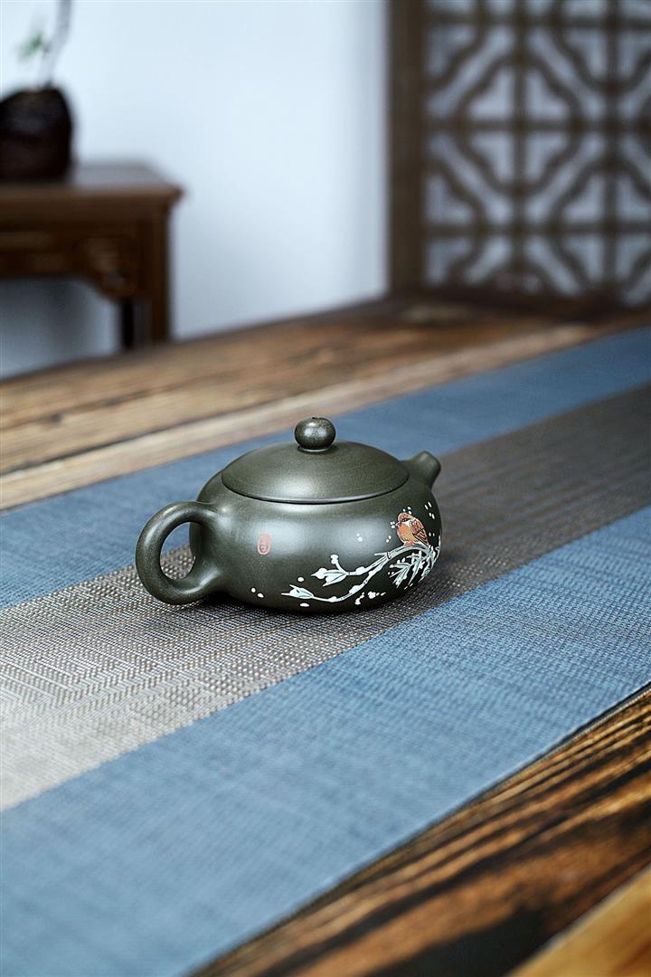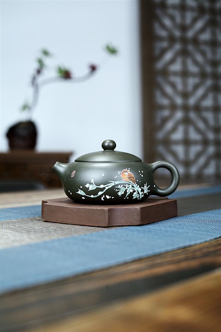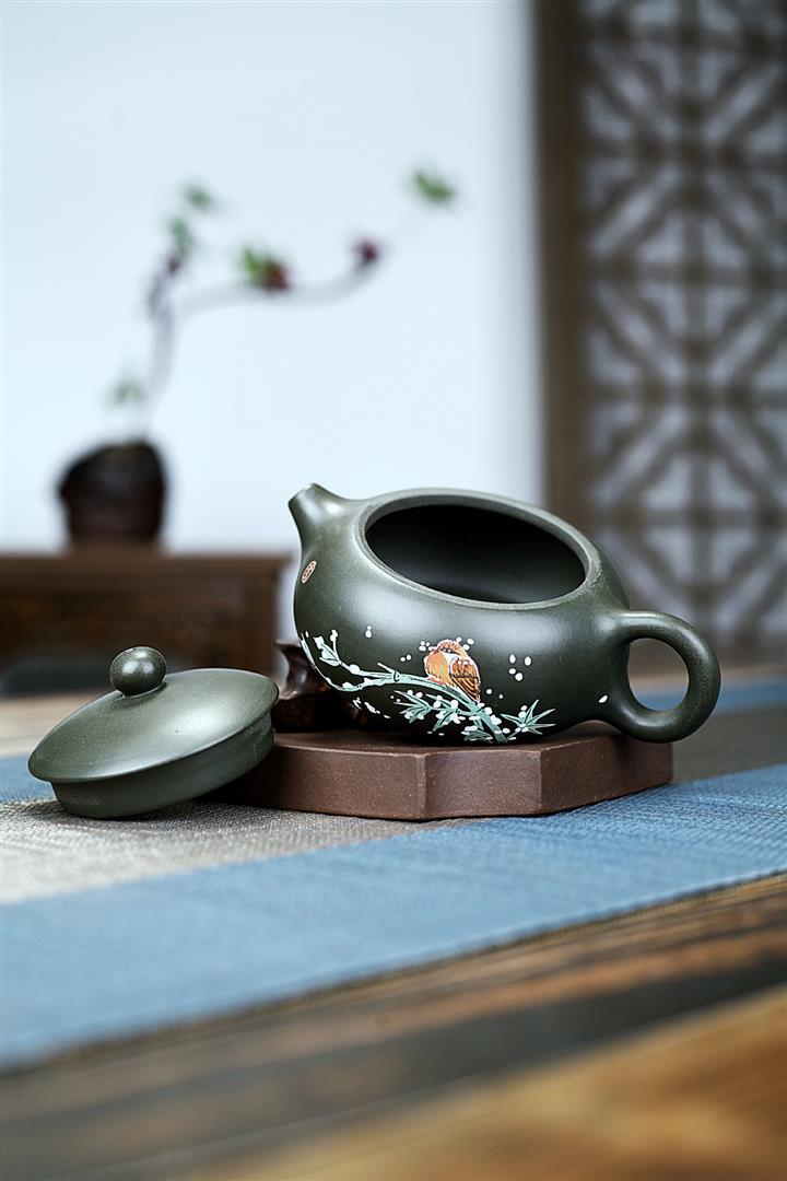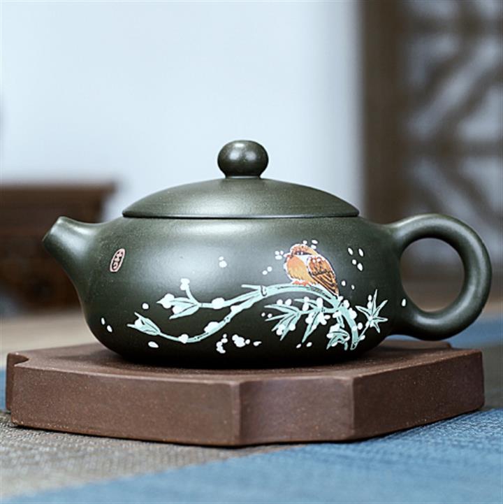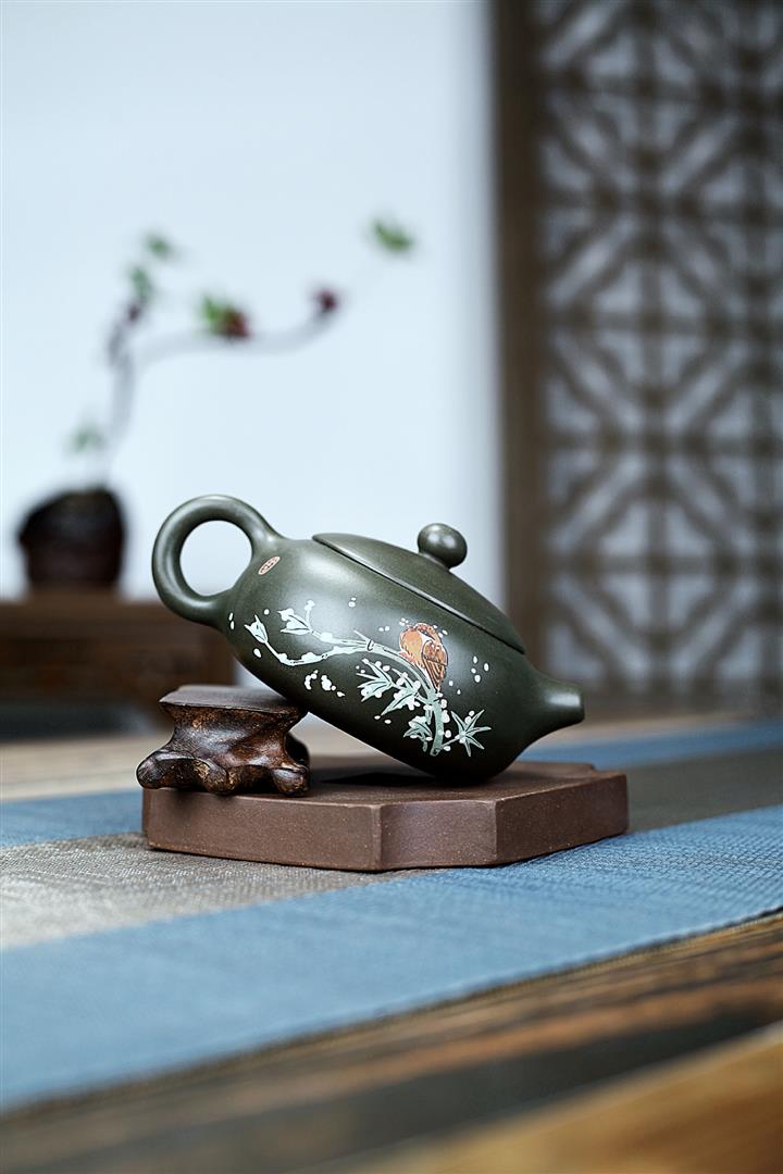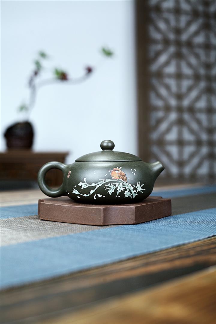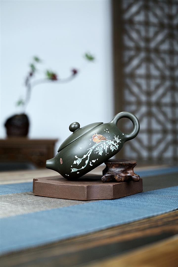原礦綠泥手工喜鵲登枝扁西施壺POT6539