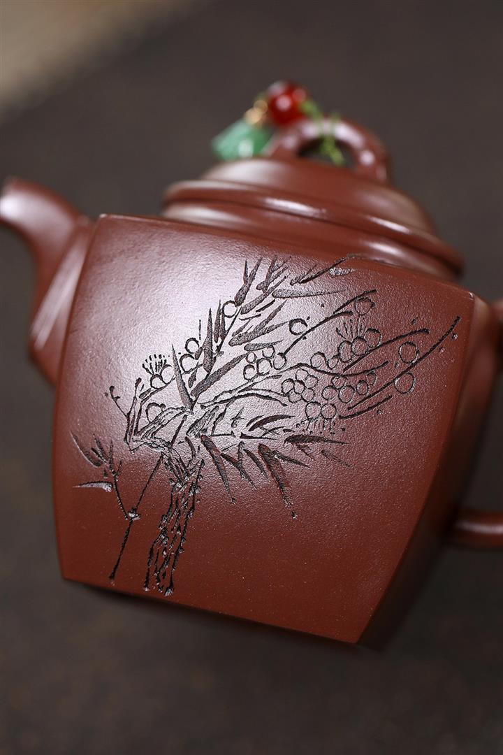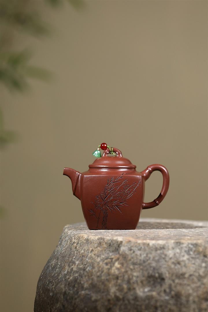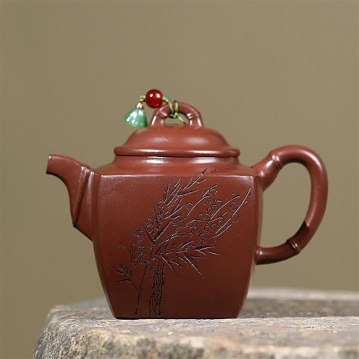 原礦赤金朱泥太湖石手工竹影漢瓦茶壺POT6566