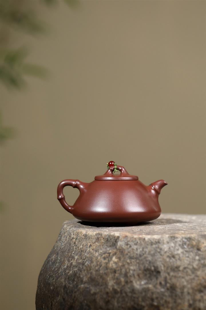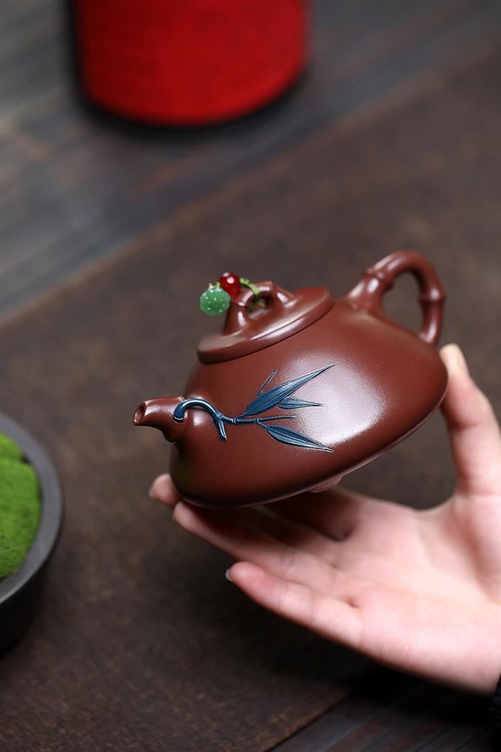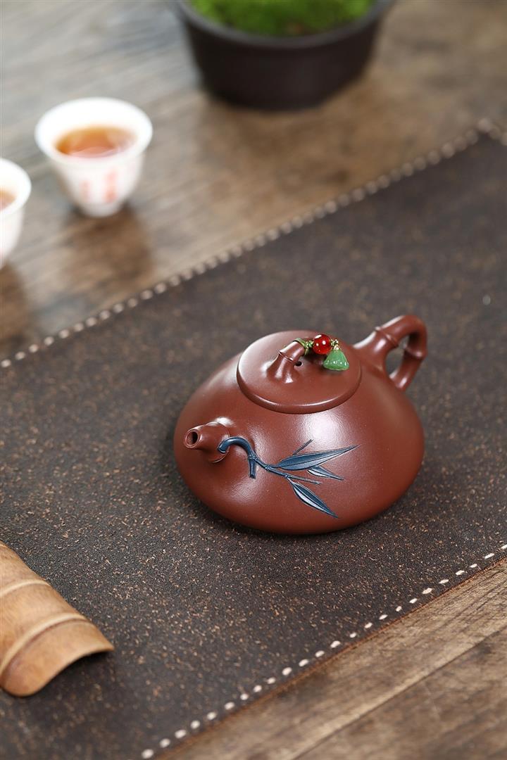 原礦赤金朱泥太湖石手工竹影漢瓦茶壺POT6566
