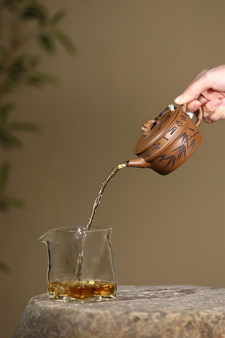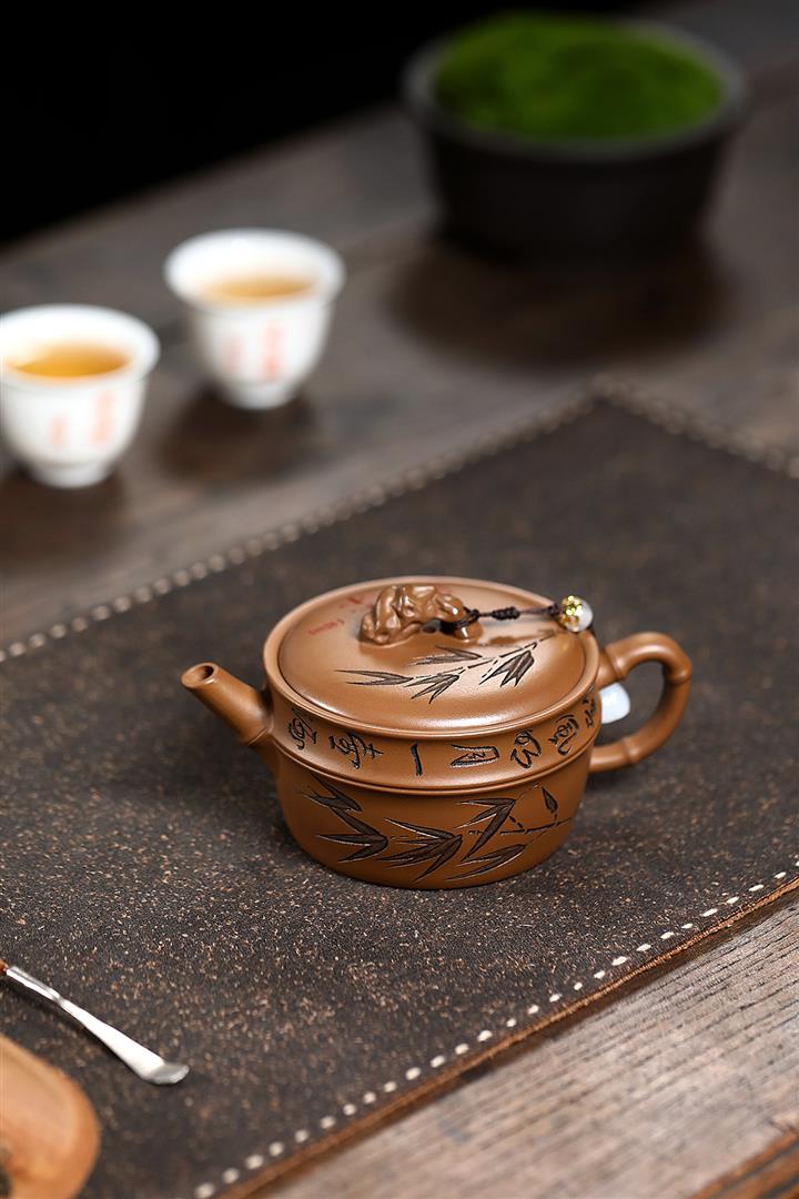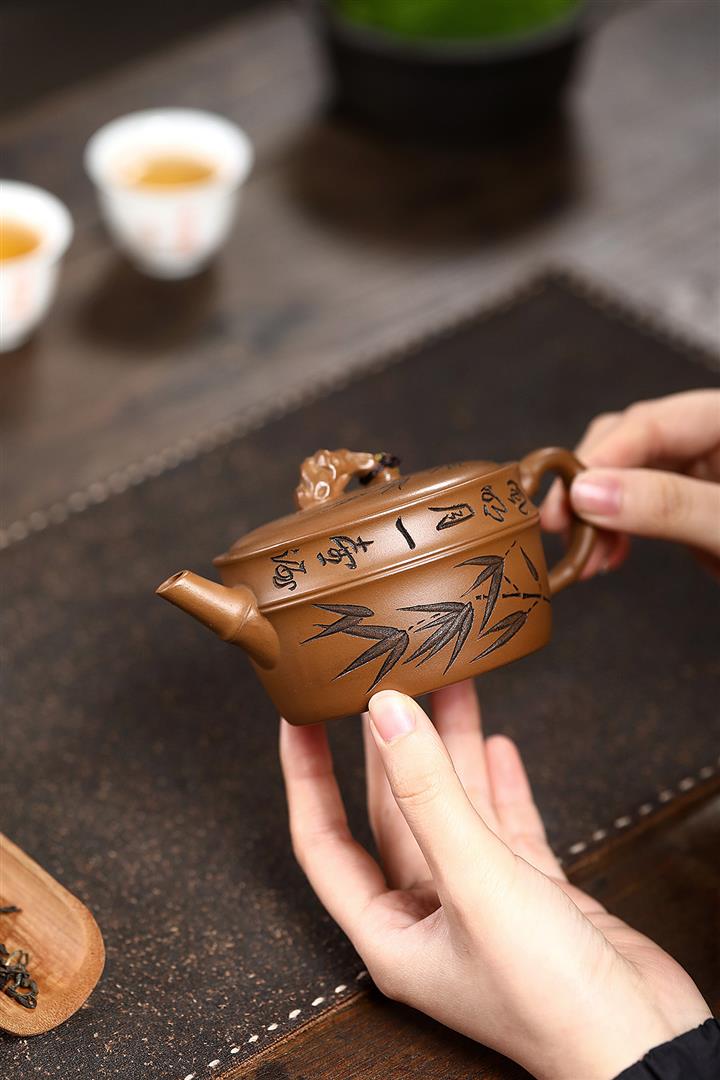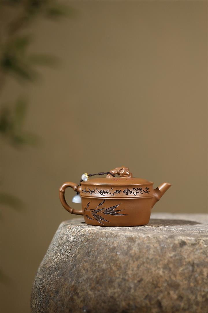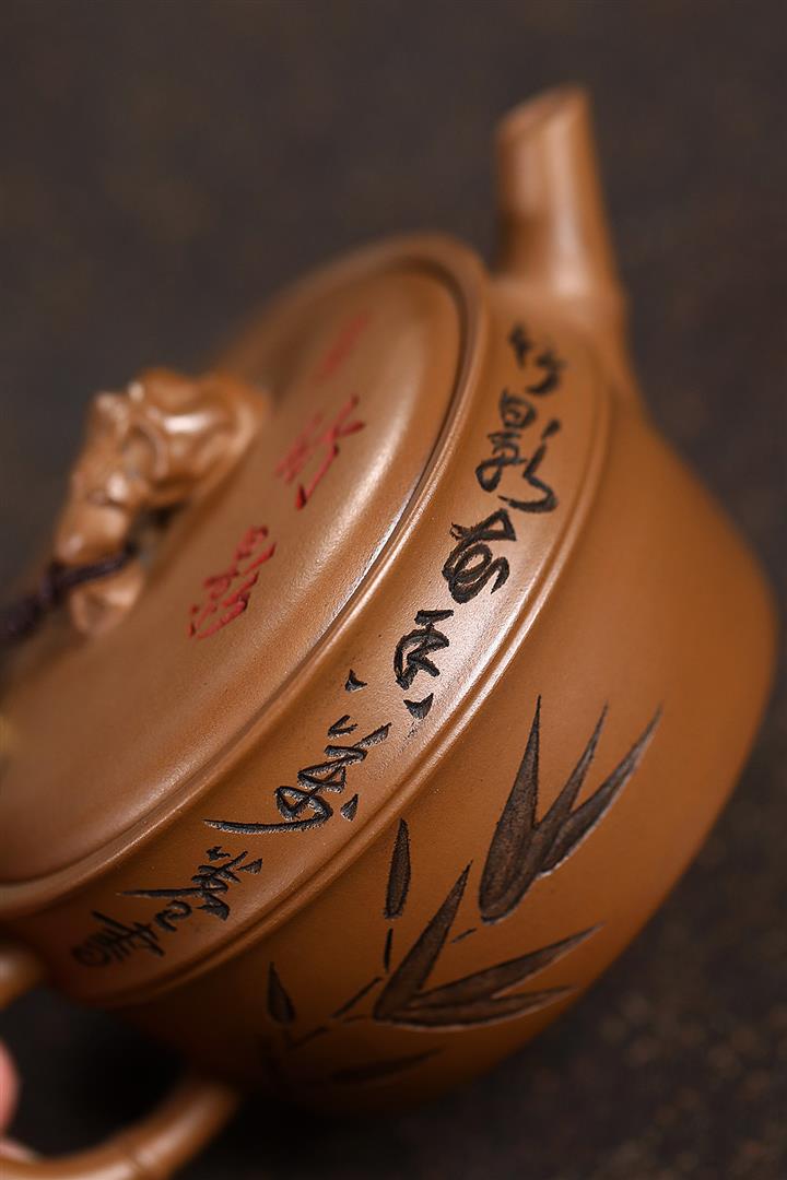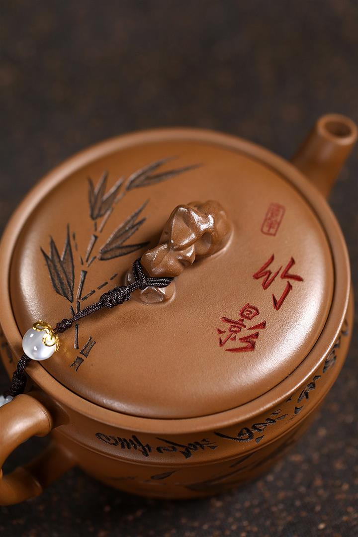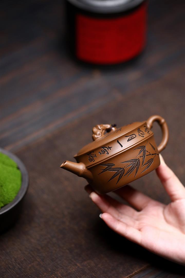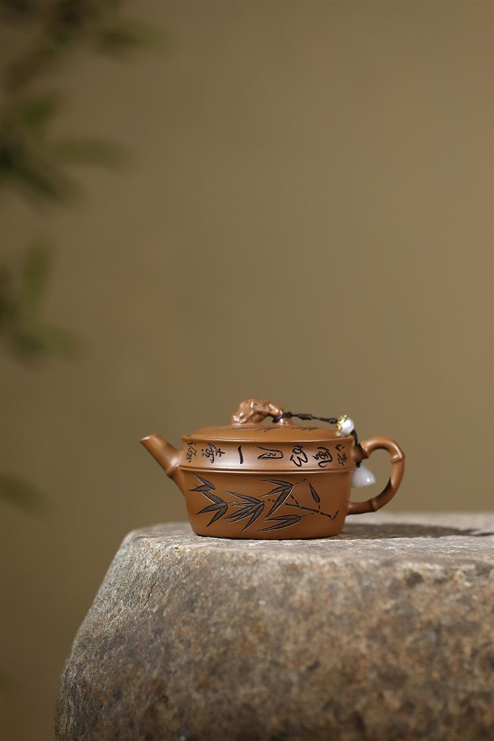 原礦赤金朱泥太湖石手工竹影漢瓦茶壺POT6566
