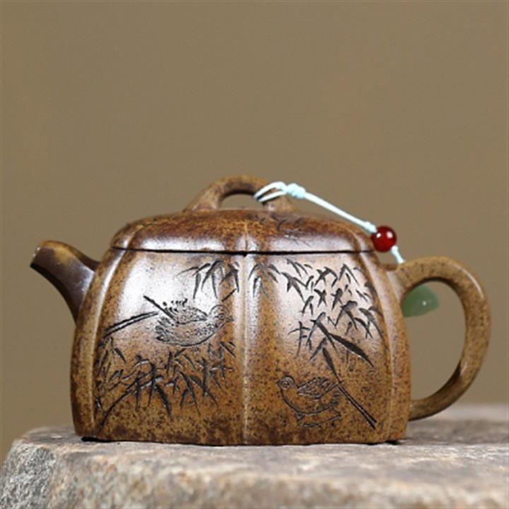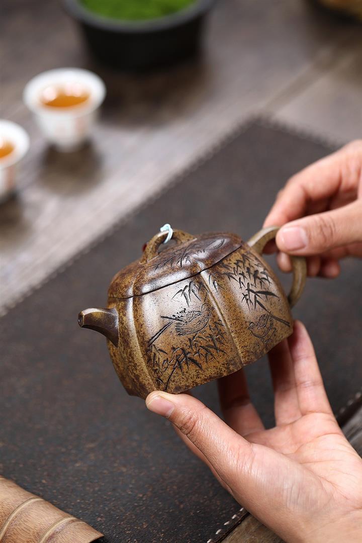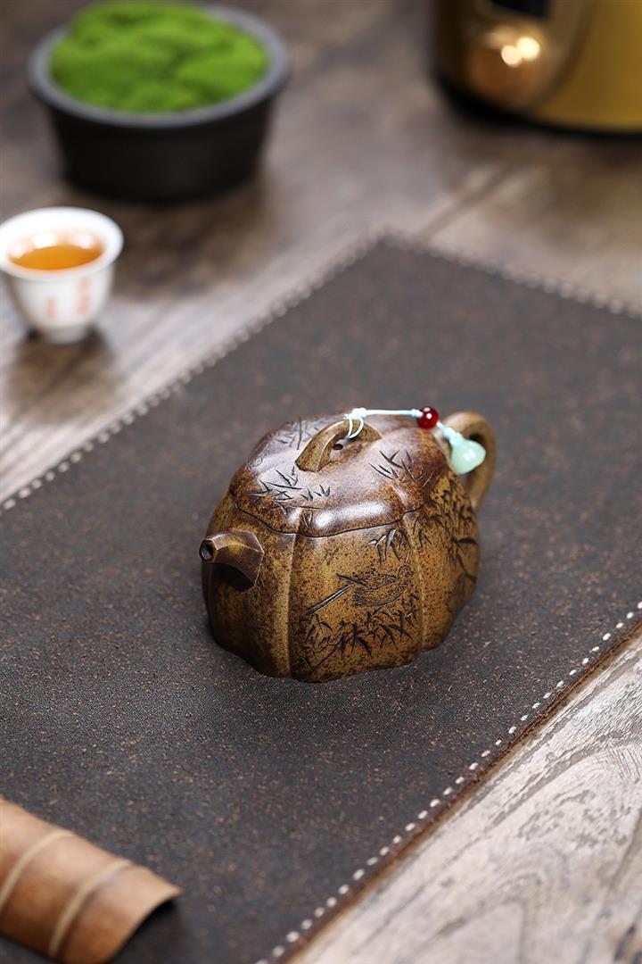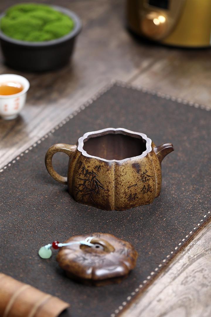 原礦龍骨金砂柴燒手工刻梅周盤茶壺POT6642