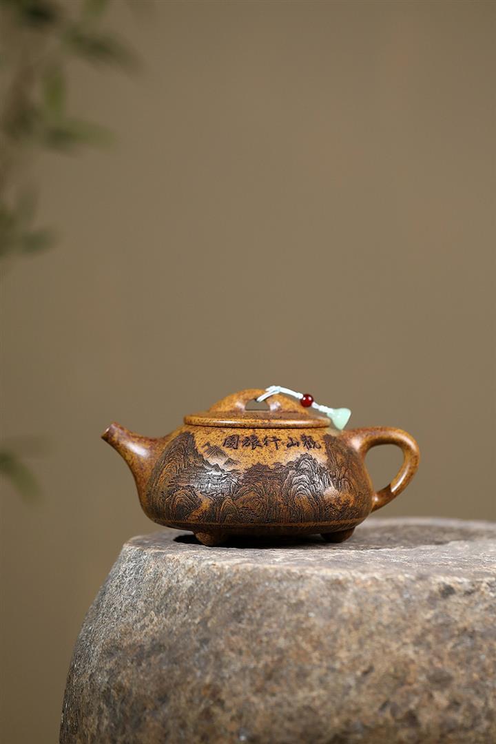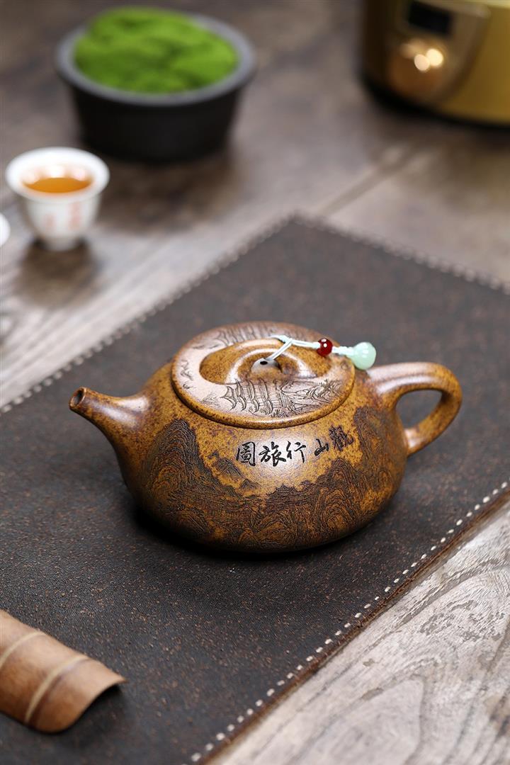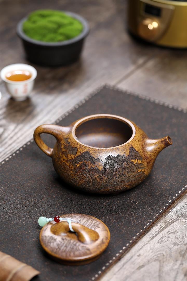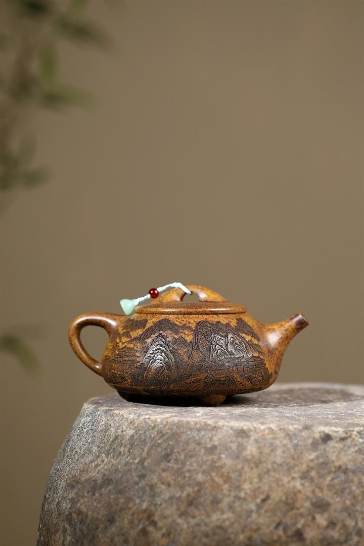 原礦高溫柴燒龍骨金砂手工觀山圖景舟石瓢壺POT6639