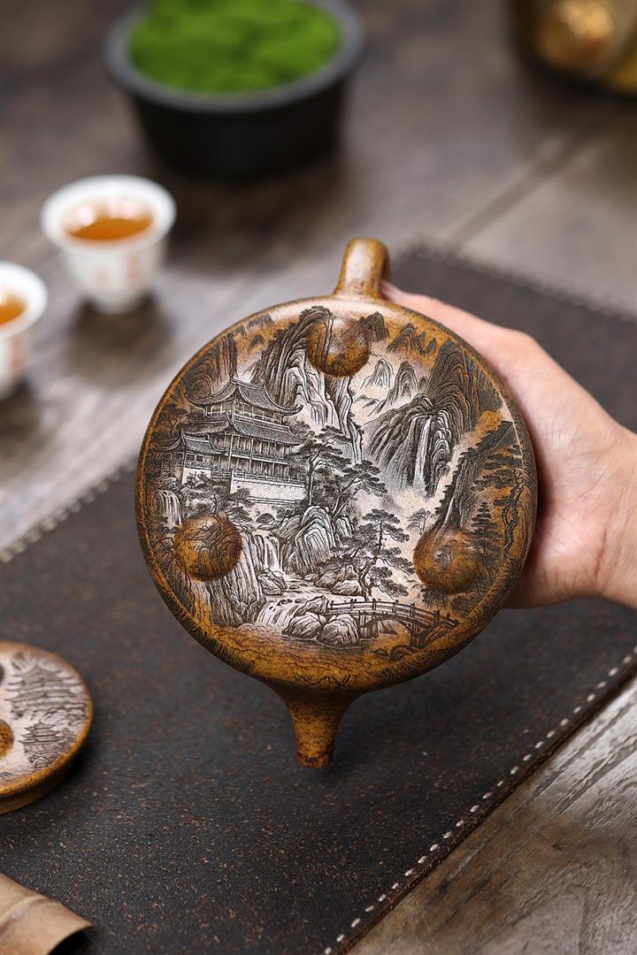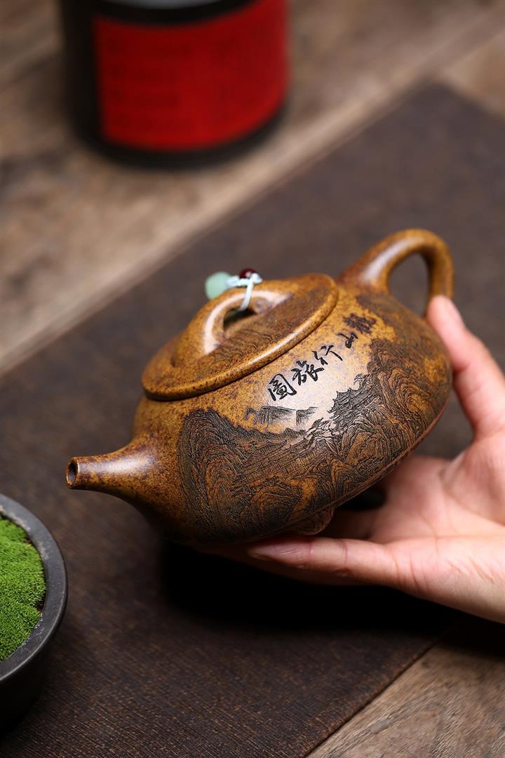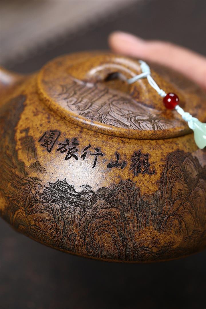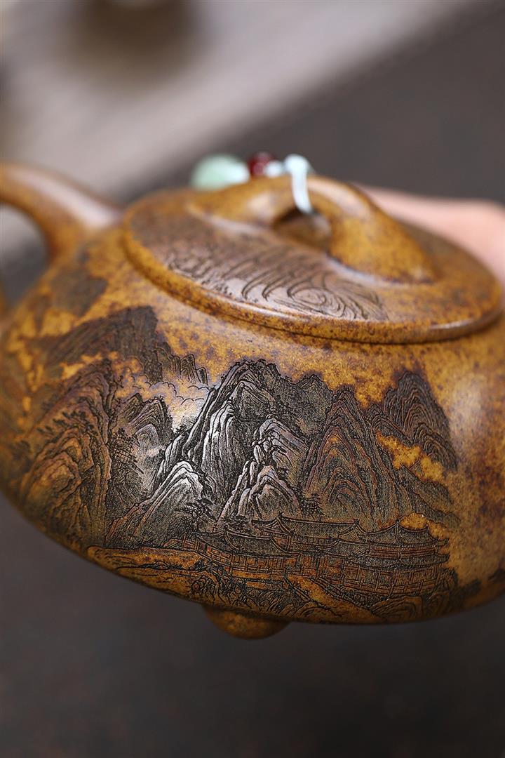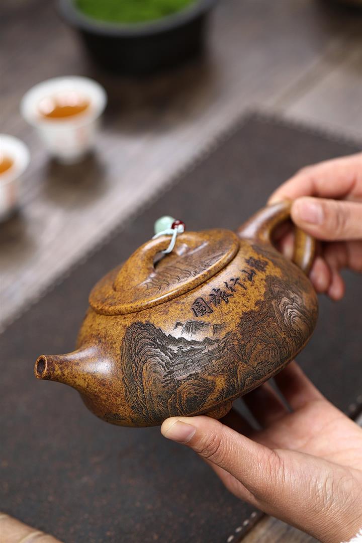 原礦高溫柴燒龍骨金砂手工觀山圖景舟石瓢壺POT6639