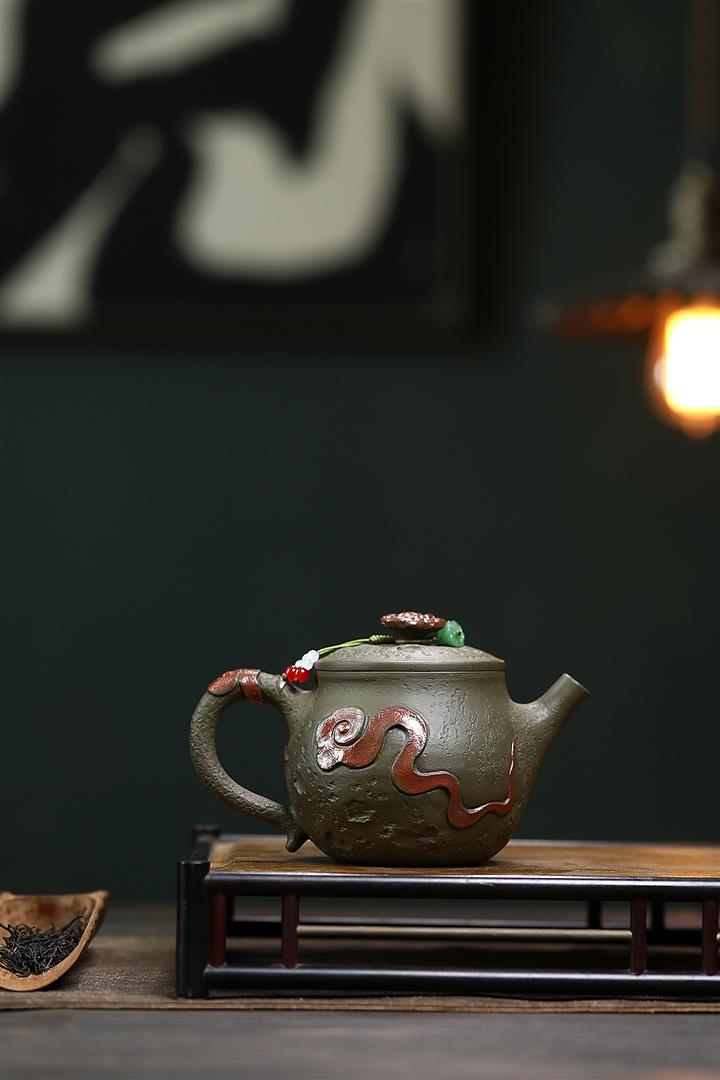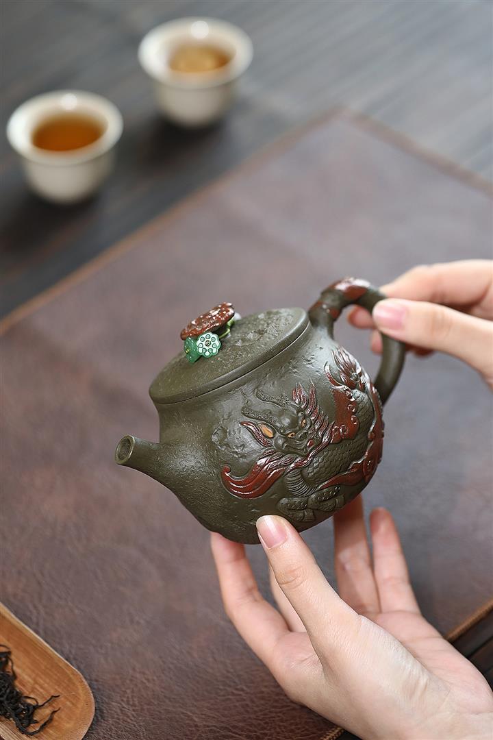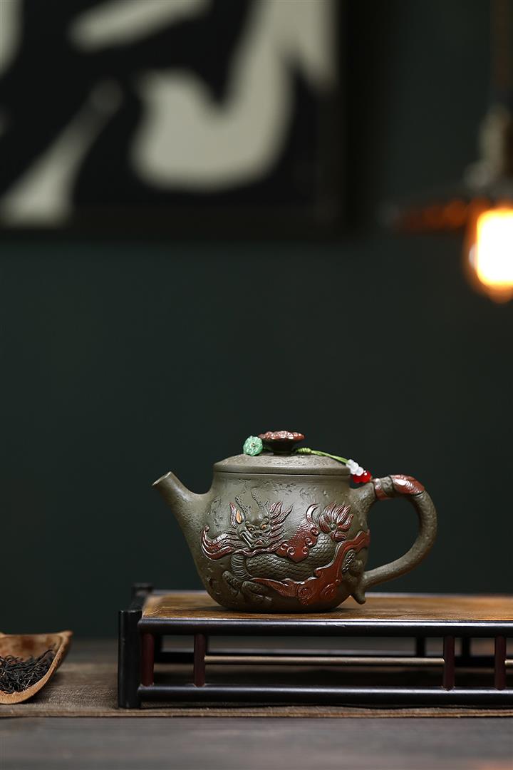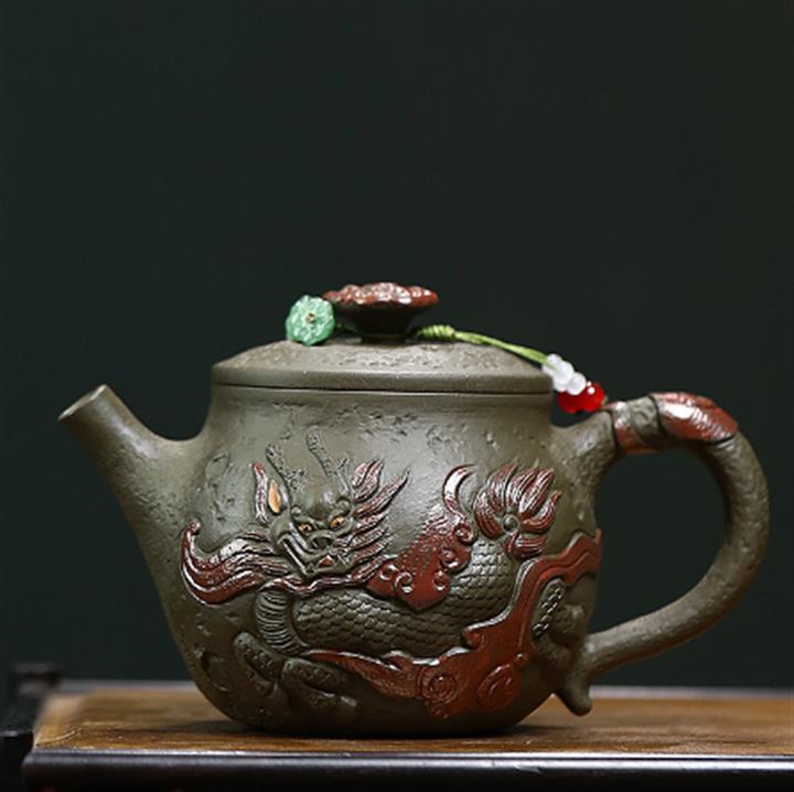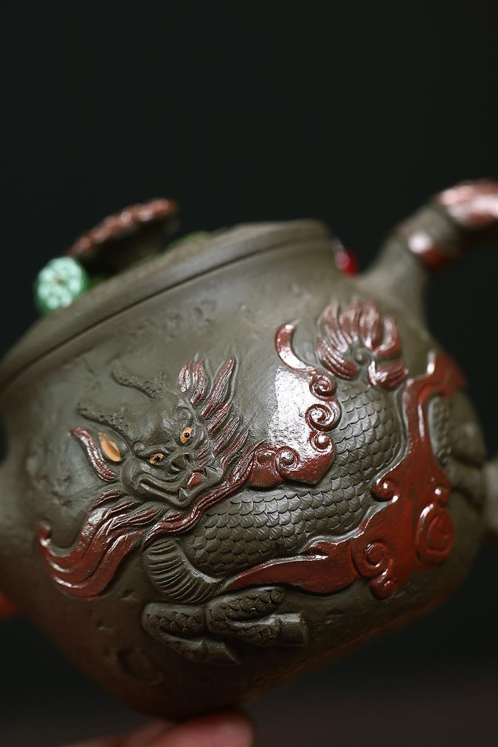 原礦墨綠泥手工蛟龍戲珠供春壺POT6674