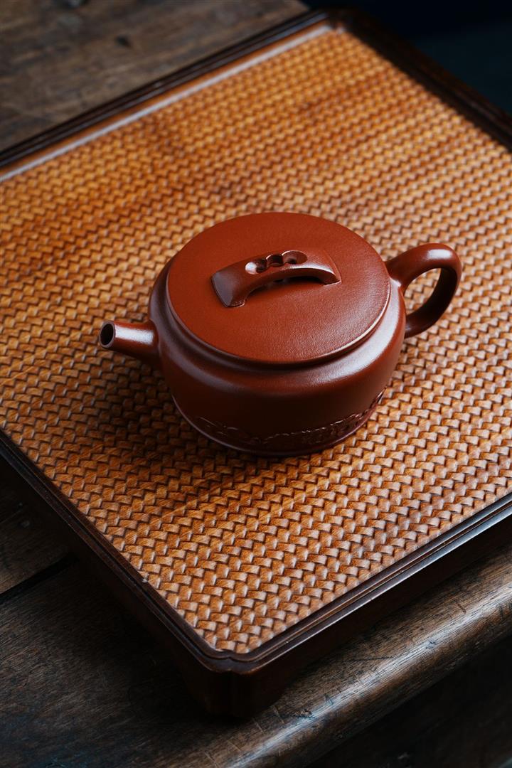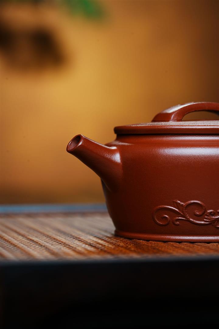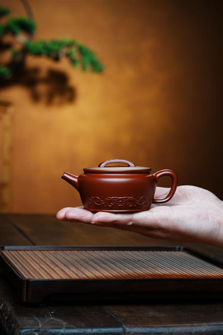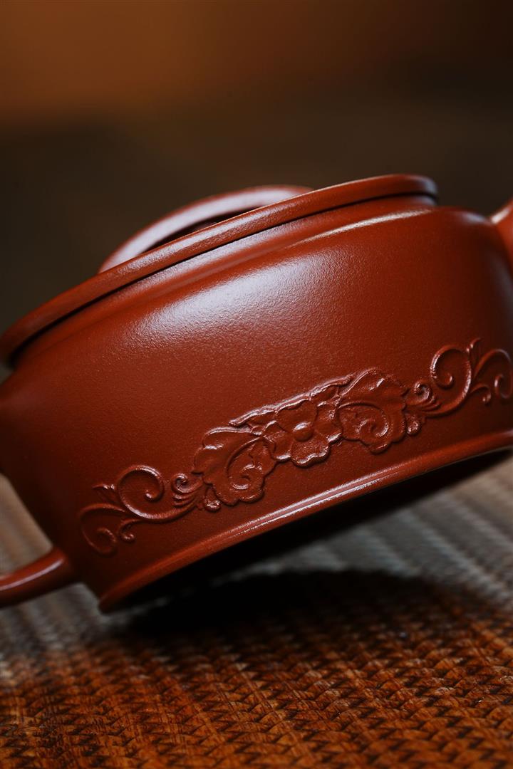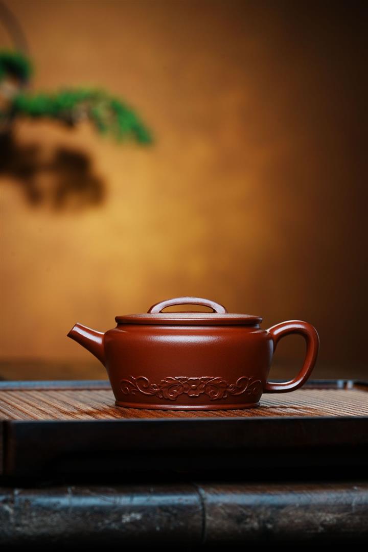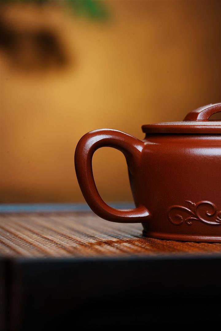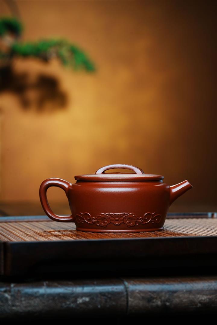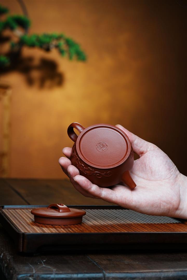 此壺為紫砂經典器型之一,造型古樸,氣韻生動。壺體渾圓碩大,渾厚華滋,線條流暢自然,壺嘴短小前沖,曲線優美,壺把自由舒展,飄逸放達,壺口略小,壺蓋略呈拱形,與戶口貼合緊密,壺鈕呈圓球狀,小巧可愛,拿捏便利,整器做工精湛,刻繪精致細膩,色澤更是靚麗典雅,令人喜愛。