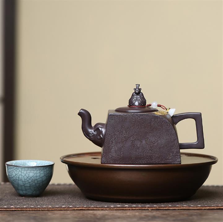 原礦紫泥手工刻字畫馬上封侯四方壺POT6737