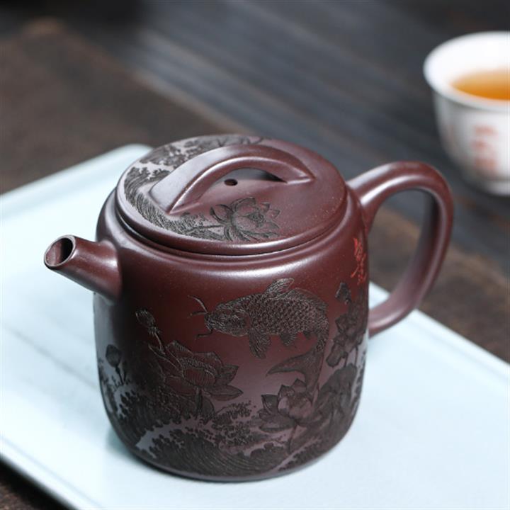 原礦紫泥手工刻字畫馬上封侯四方壺POT6737