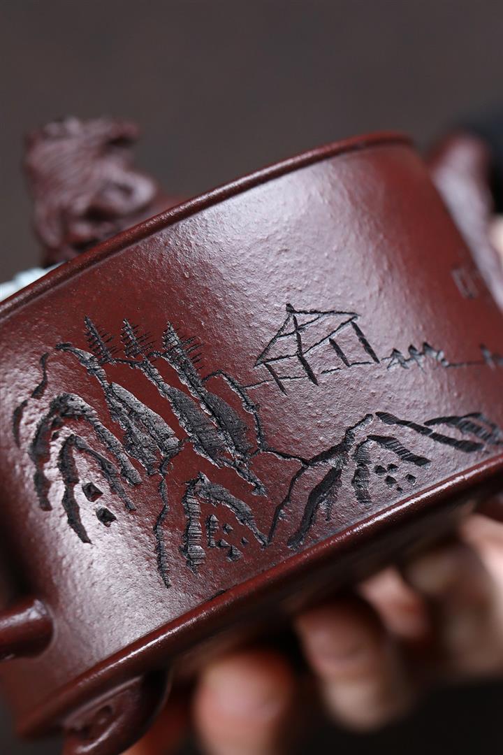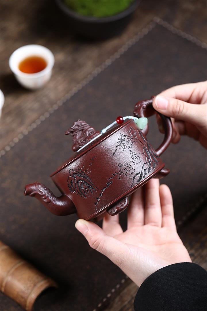 原礦紫泥手工刻字畫馬上封侯四方壺POT6737