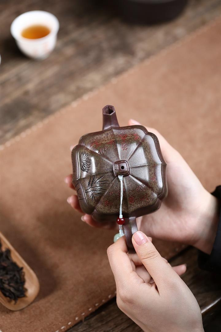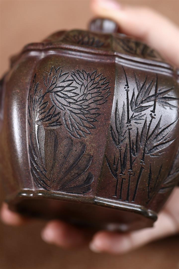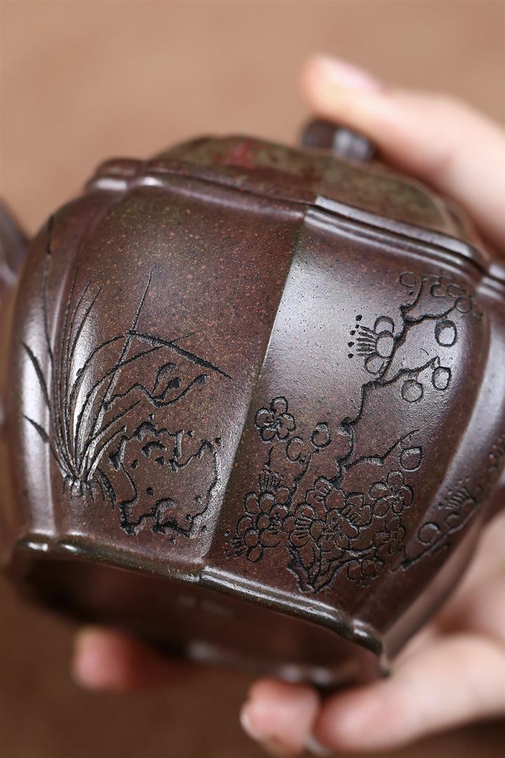 原礦紫泥手工刻字畫馬上封侯四方壺POT6737