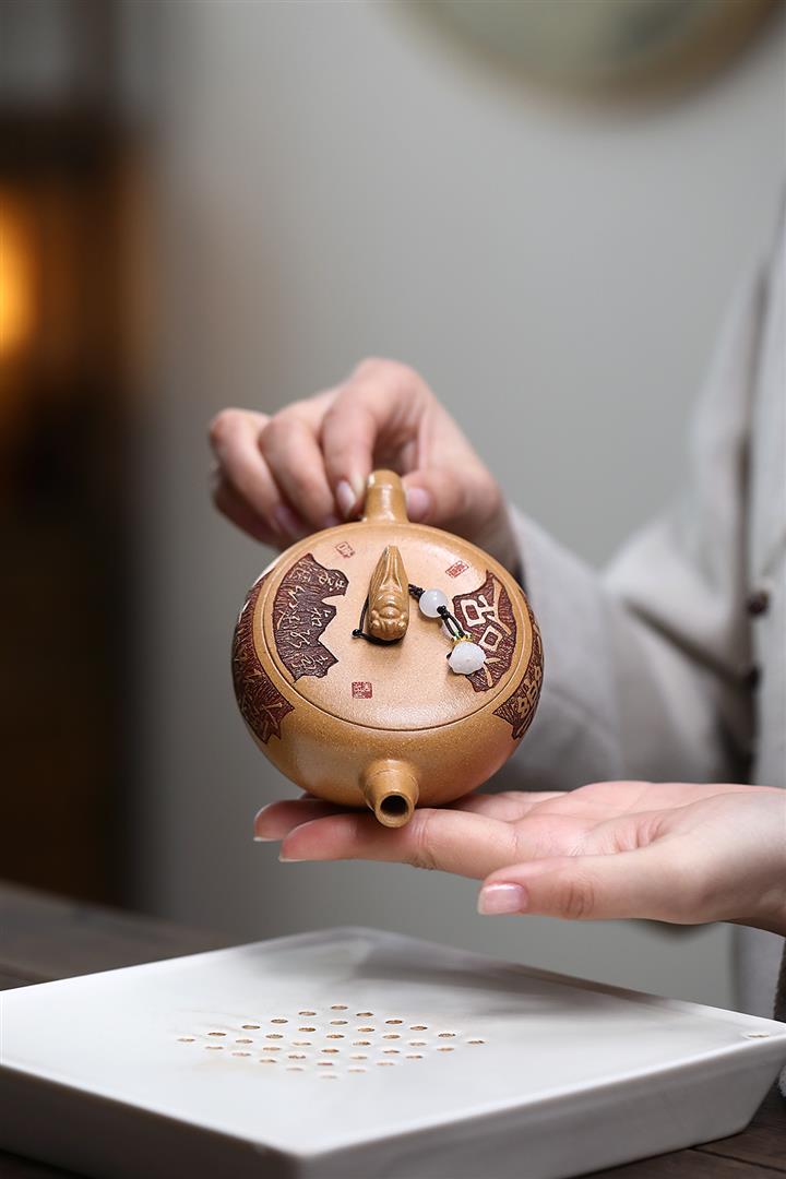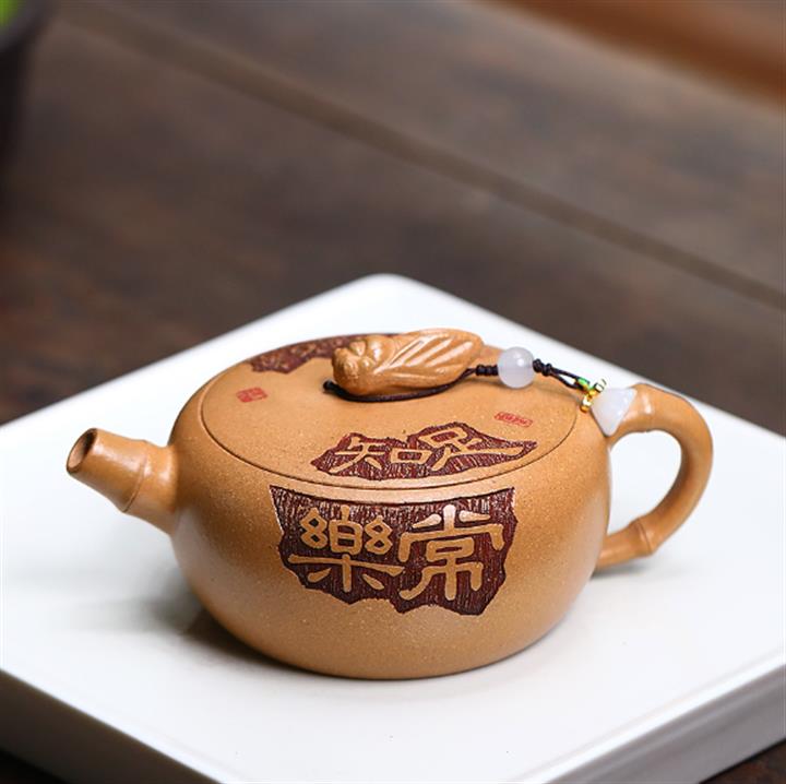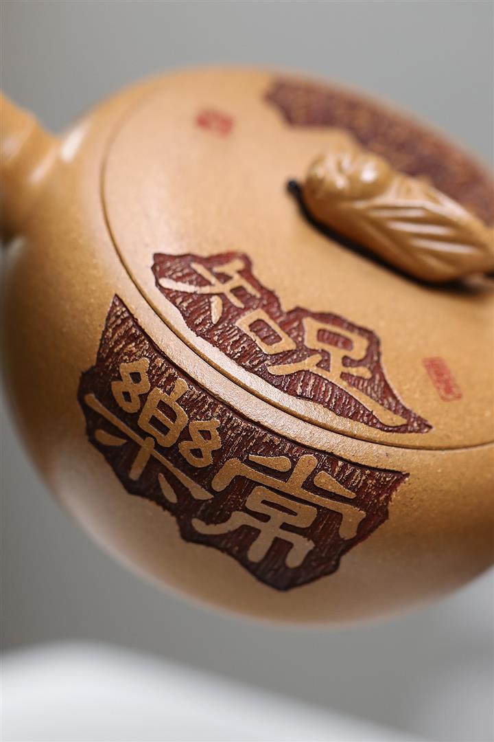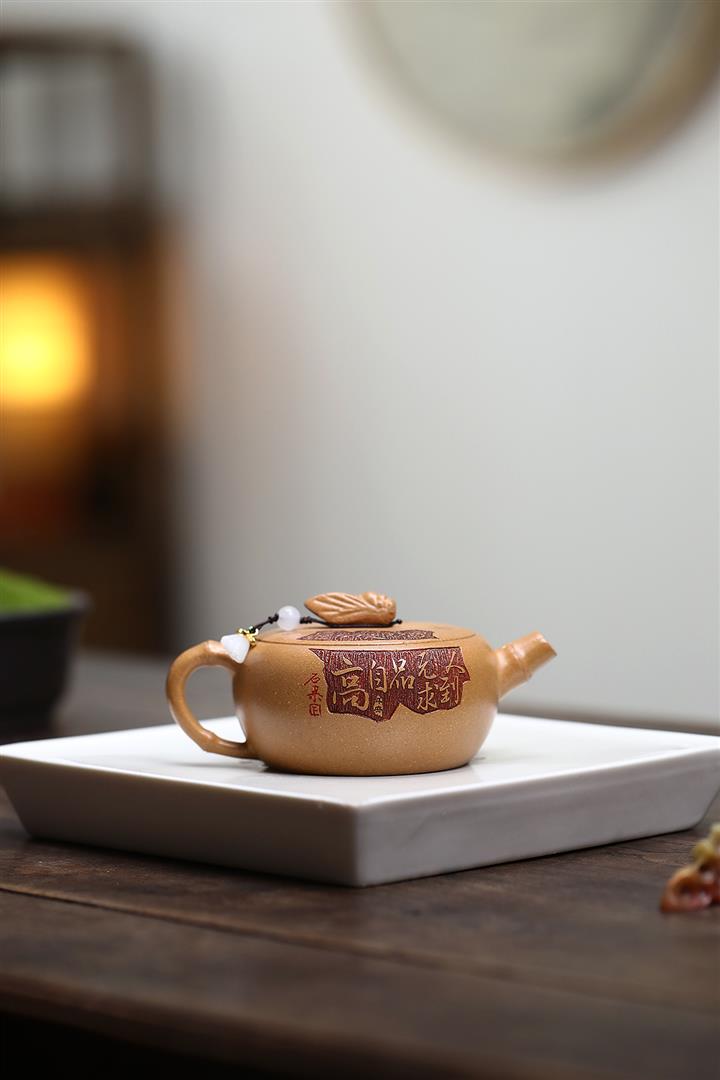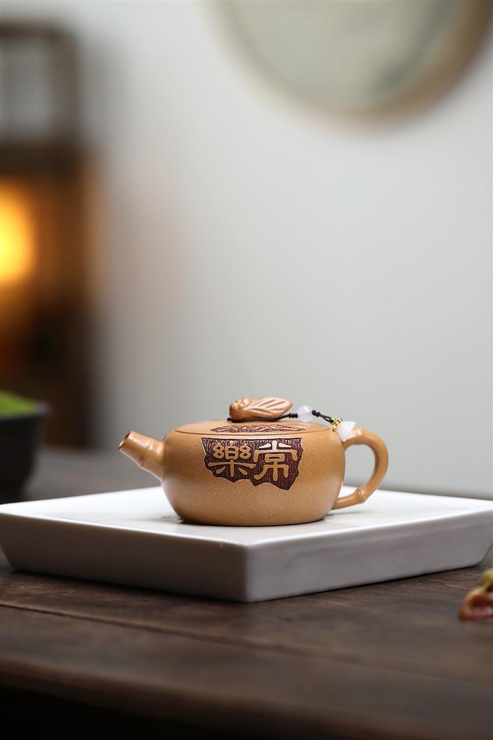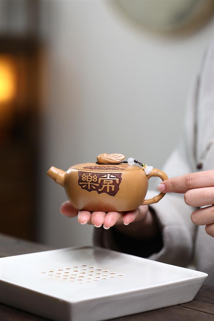 【簡介】此壺比例勻稱,精巧可愛,色澤明暗有度,古雅大氣,在泥色和勾勒效果上更顯清素典雅,整器渾圓柔美,高雅光潤,註重實用性和藝術性,淩厲飄逸,自成一派,收藏價值倍增。耳型壺把,拿捏舒適,精製外觀,簡約時尚,溫暖隨行,壺到「福」到,你值得擁有。