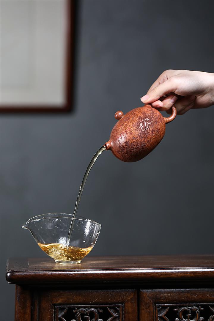 【泥料特點】砂土氣重,似淳實農民,日久使用,漸露鋒芒,養成變化甚大,溫潤莊重。線條優美自然,嘴把搭配協調,身桶配上細長的把搭配,更顯優生動……