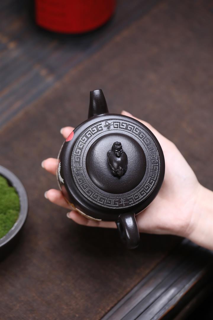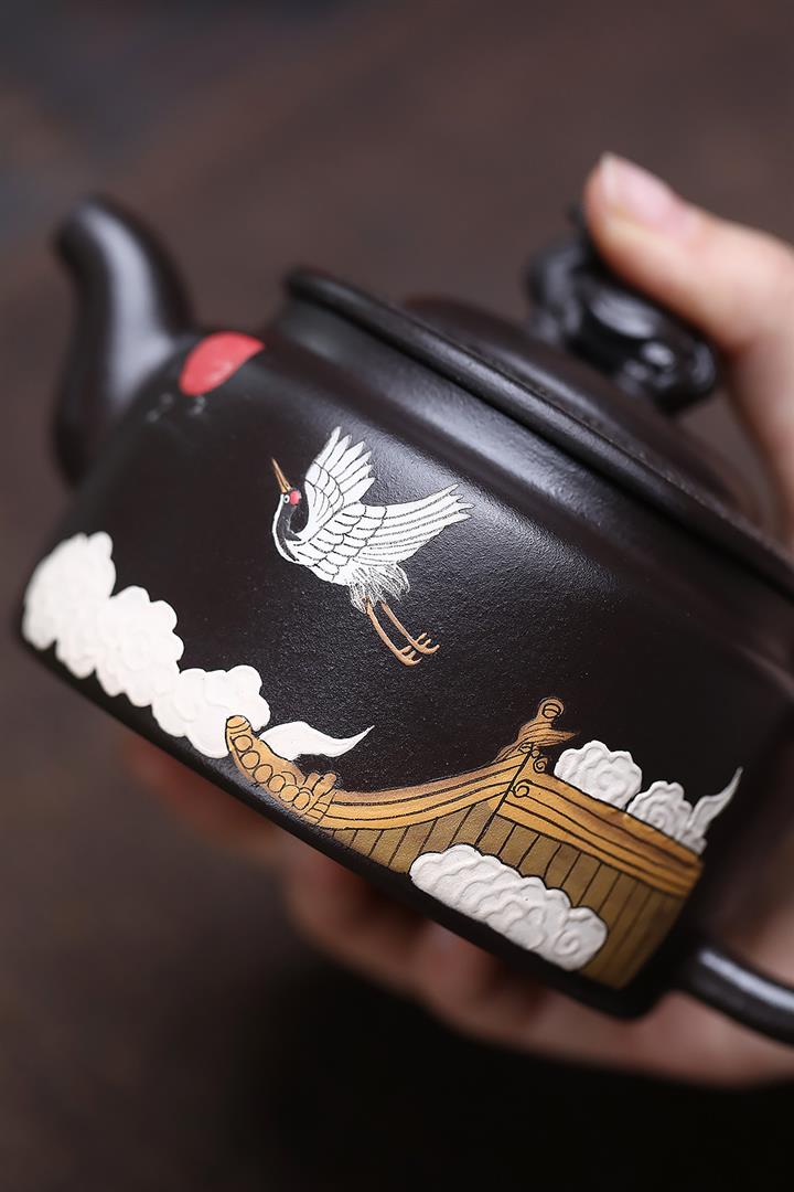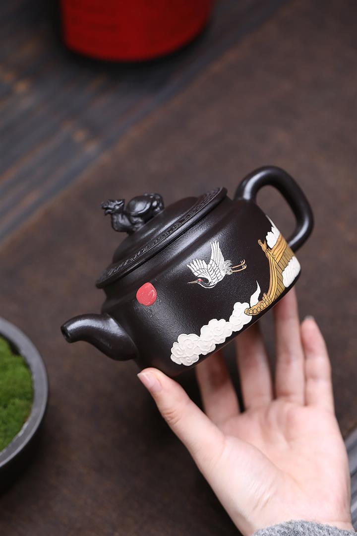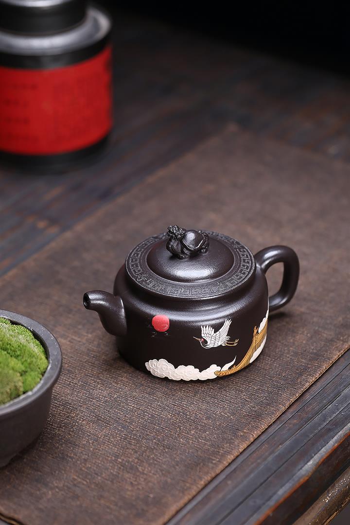 原礦黑泥彩繪仙鶴龍龜茶壺POT6832