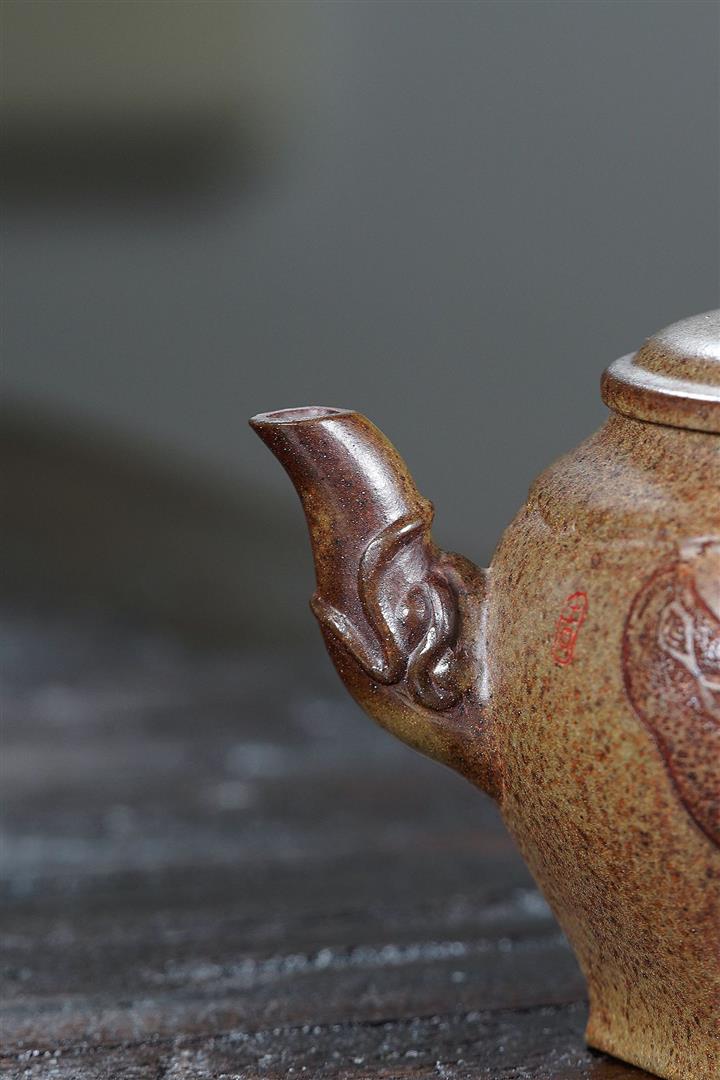 【泥料特點】砂土氣重,似淳實農民,日久使用,漸露鋒芒,養成變化甚大,溫潤莊重。線條優美自然,嘴把搭配協調,身桶配上細長的把搭配,更顯優生動……