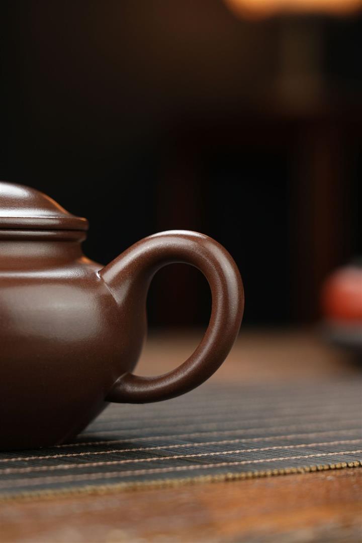 【泥料特點】砂土氣重,似淳實農民,日久使用,漸露鋒芒不成變化甚大,溫潤莊重。線條優美自然,嘴把搭配協調,身頂部細長的把搭配,更顯優雅