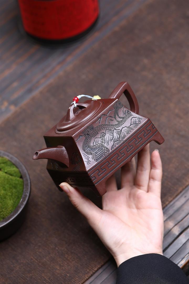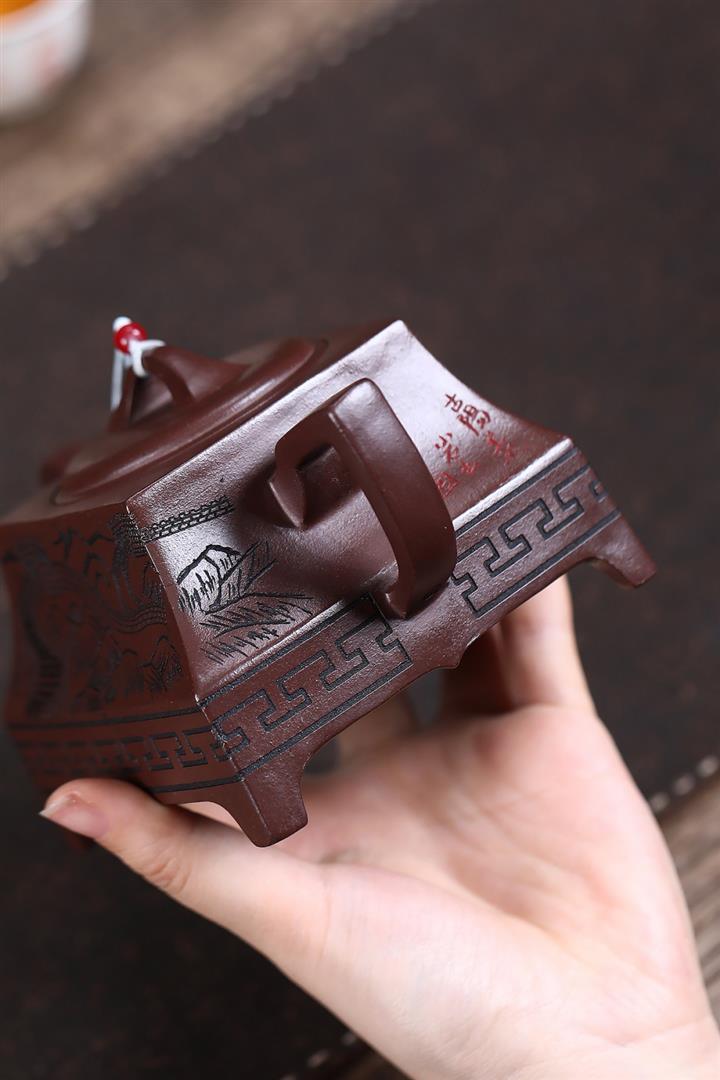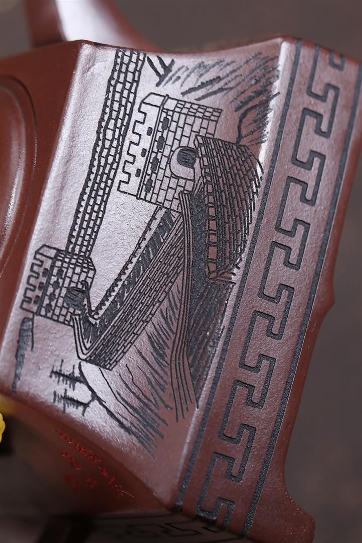 原礦老紫泥滿刻四方橋鼎壺POT6977