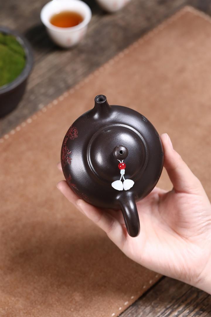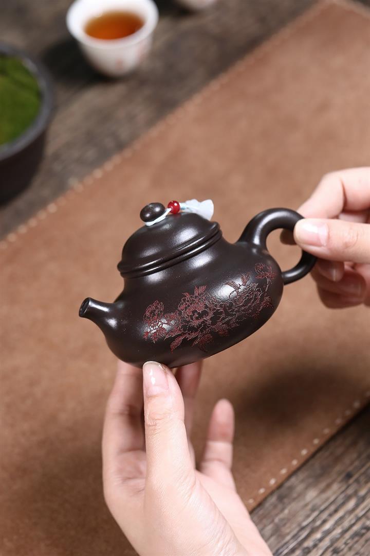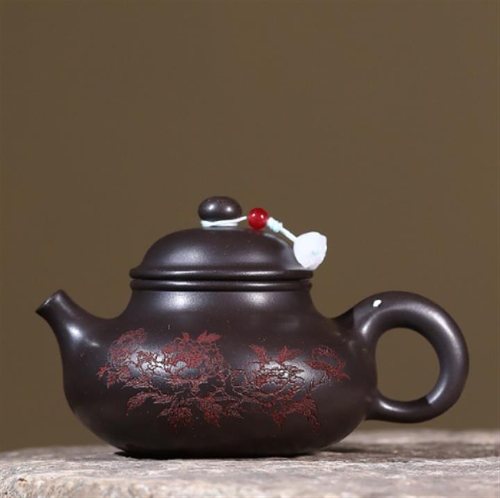 原礦石黃泥刻繪牡丹金鐘茶壺POT6993