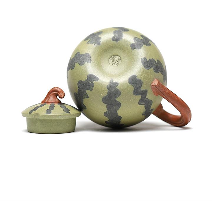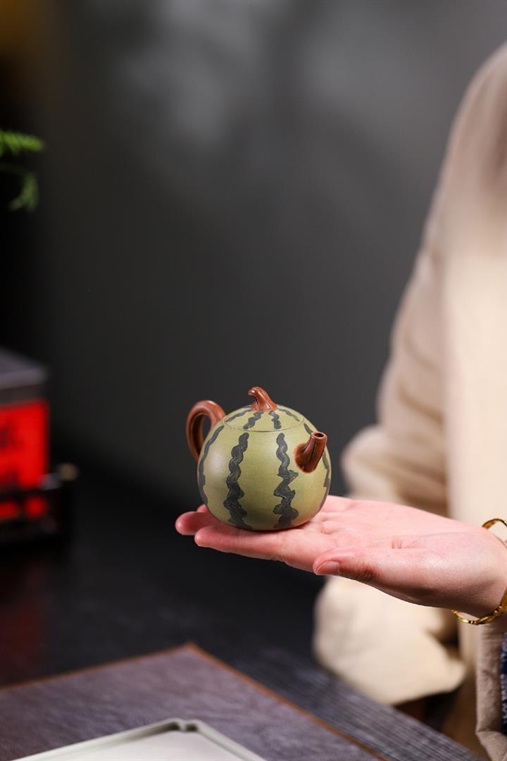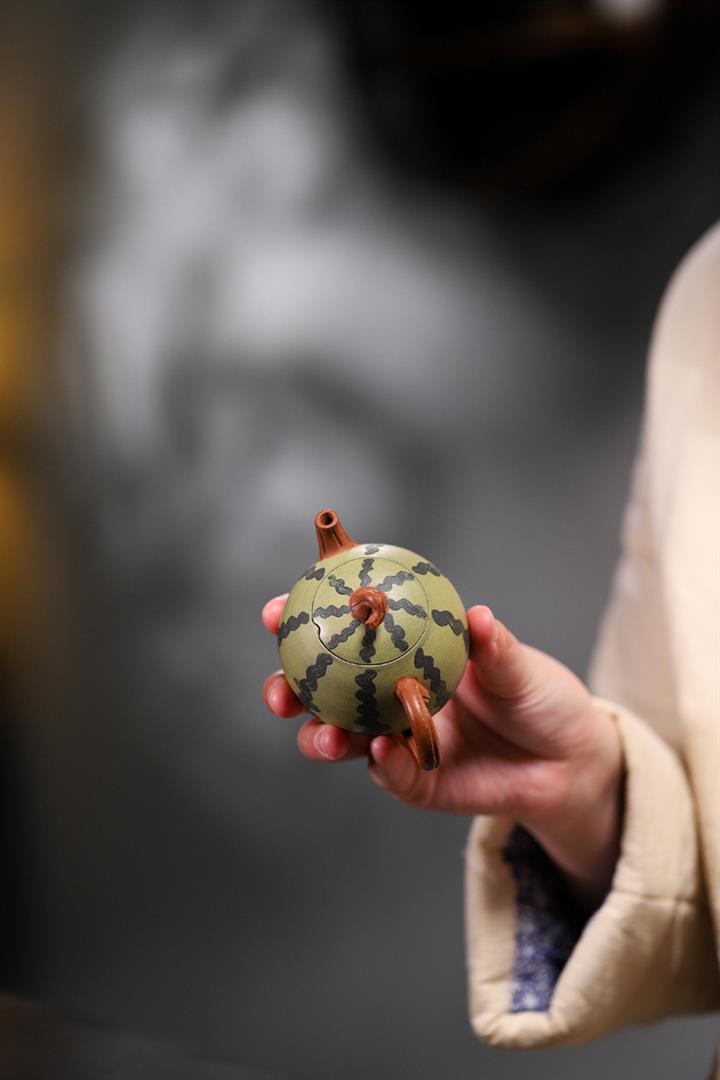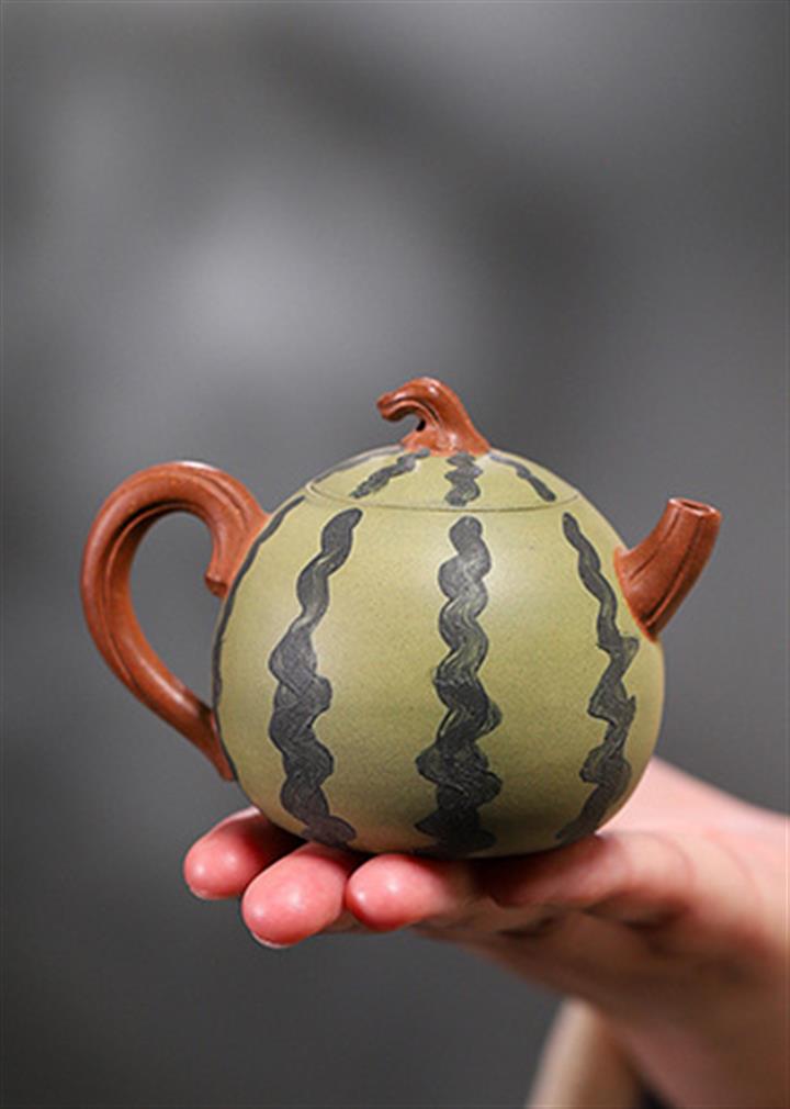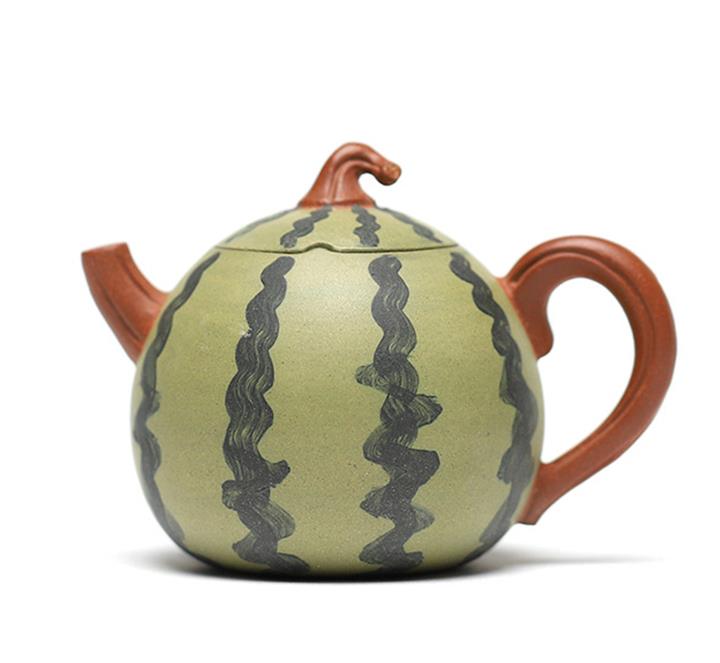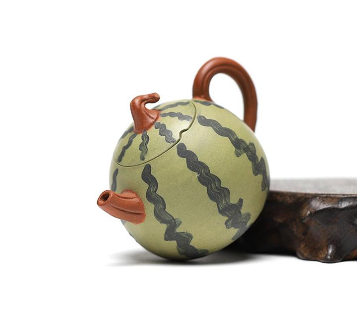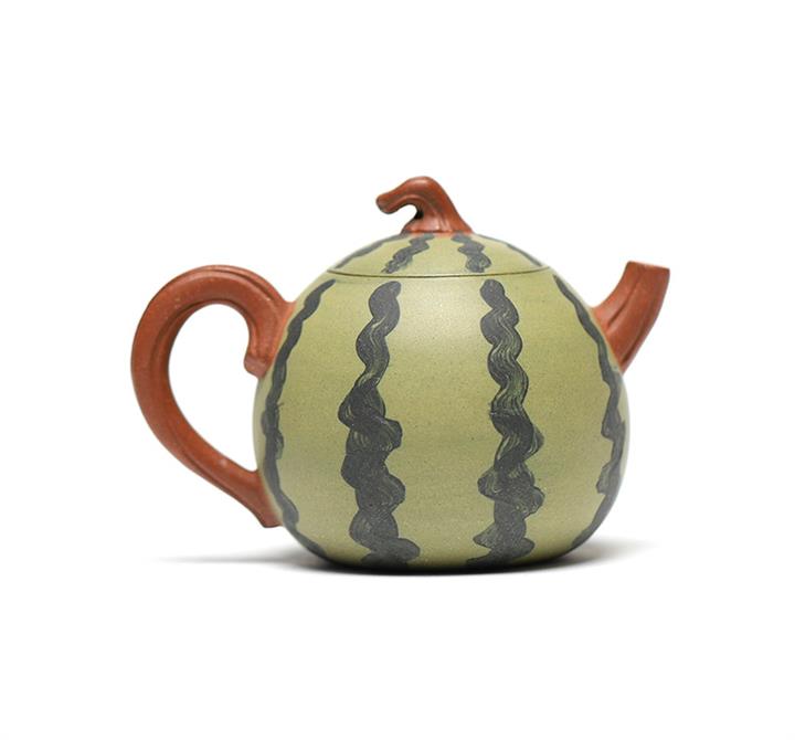 【簡介】此西瓜以綠泥作胎,身筒渾圓,恰似壹薄皮西瓜,瓜皮肌理的塑造惟妙惟肖。鈕、流、把如藤枝虬曲而出,與嫩綠色瓜皮形成強烈對比,整器仿生形象,俏皮可愛,盡顯田園意趣。