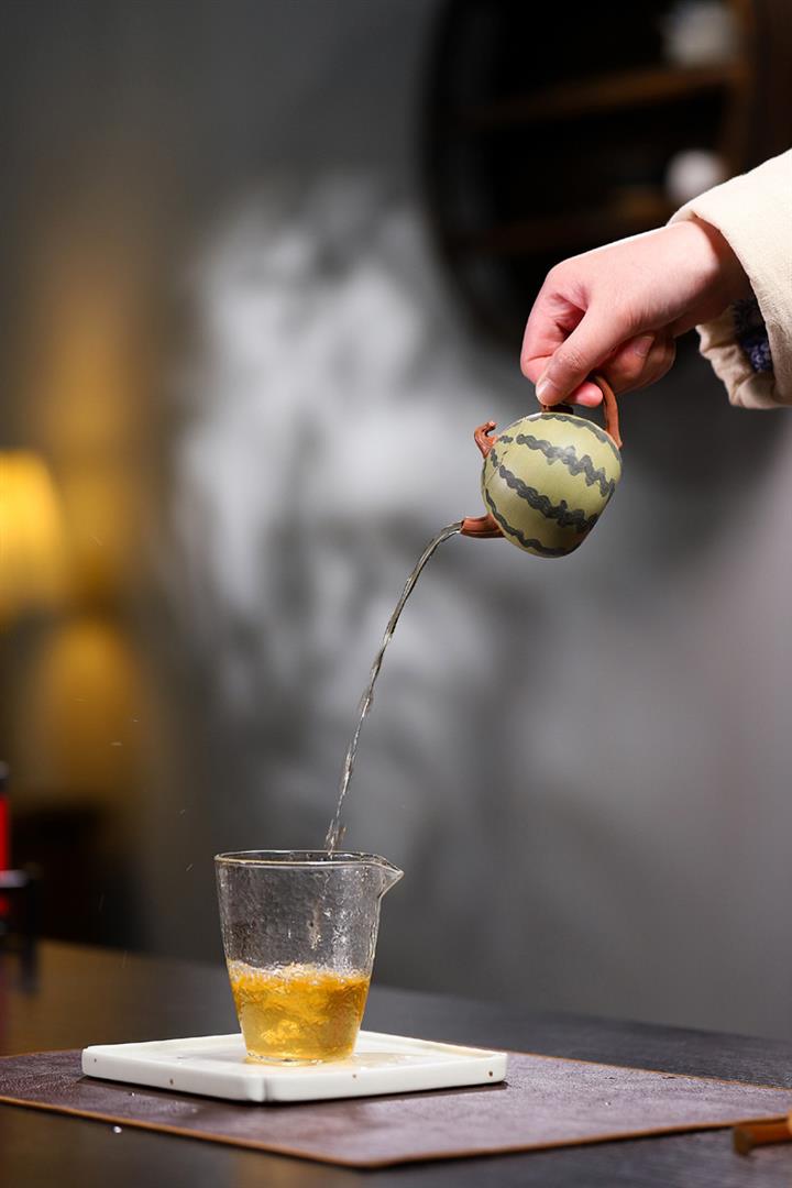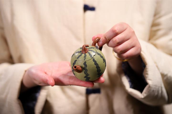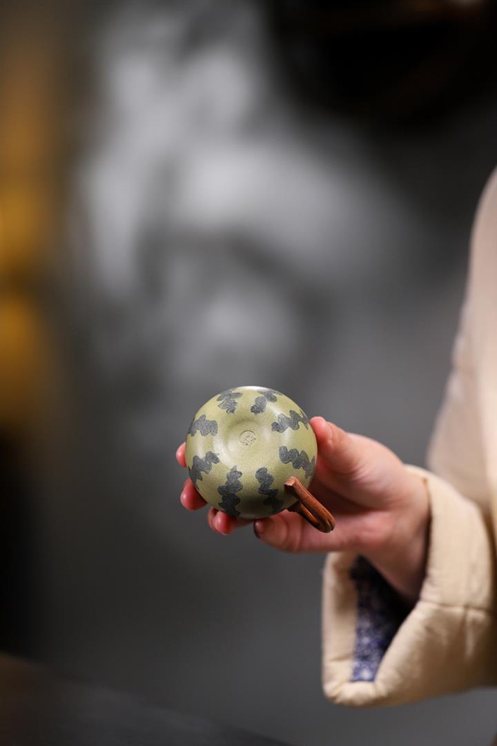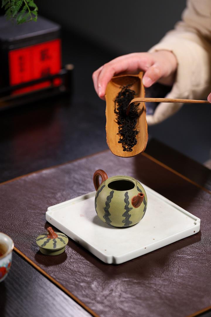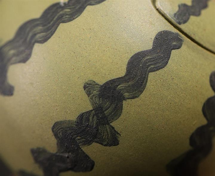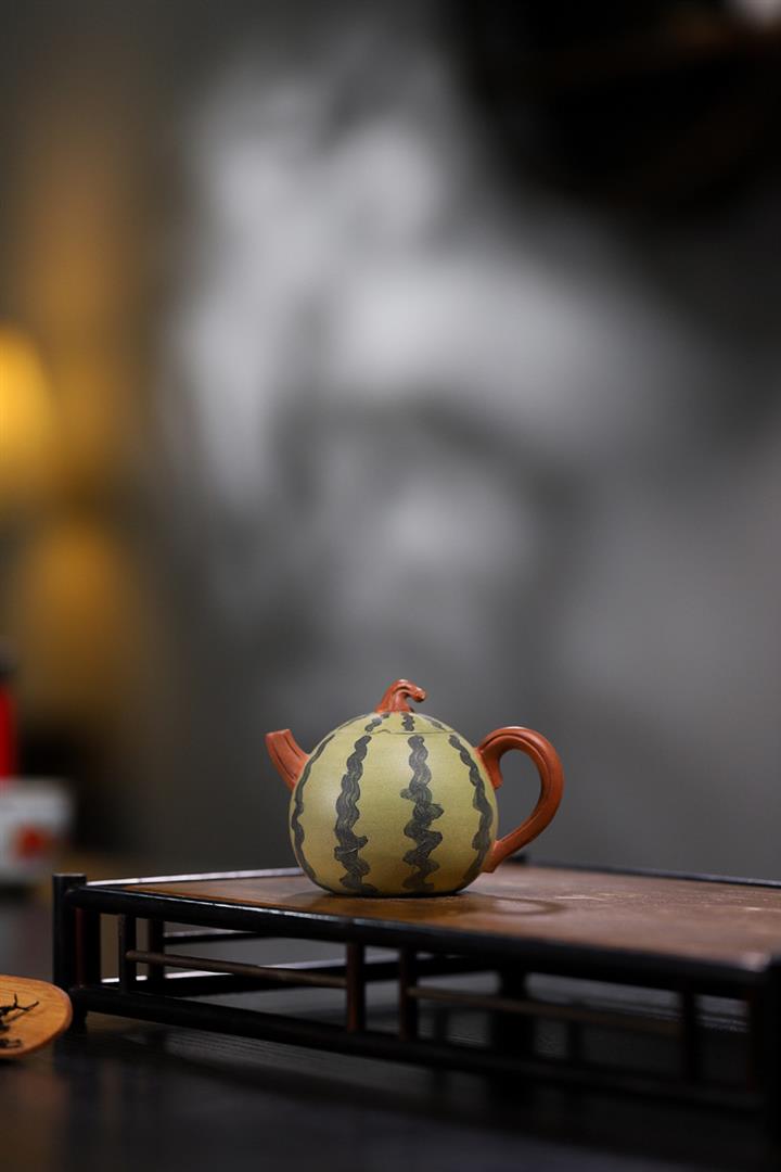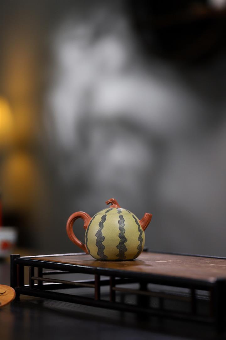 【簡介】此西瓜以綠泥作胎,身筒渾圓,恰似壹薄皮西瓜,瓜皮肌理的塑造惟妙惟肖。鈕、流、把如藤枝虬曲而出,與嫩綠色瓜皮形成強烈對比,整器仿生形象,俏皮可愛,盡顯田園意趣。