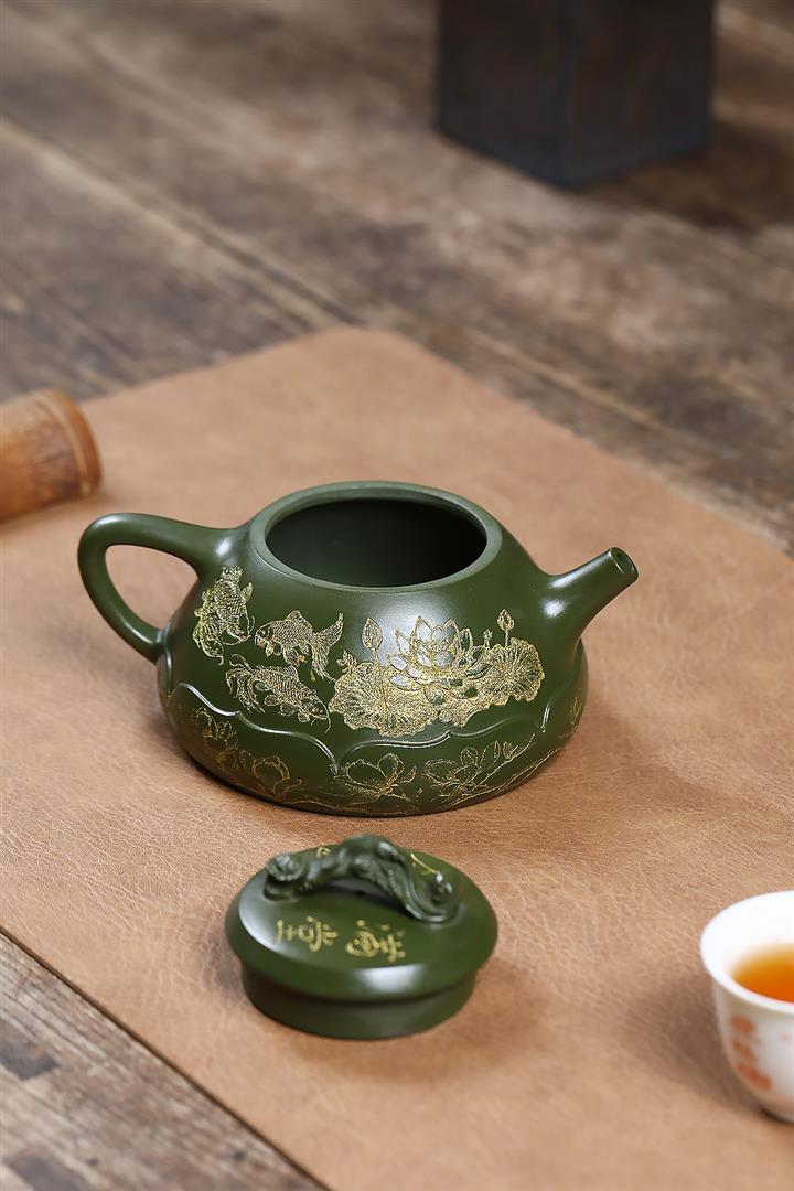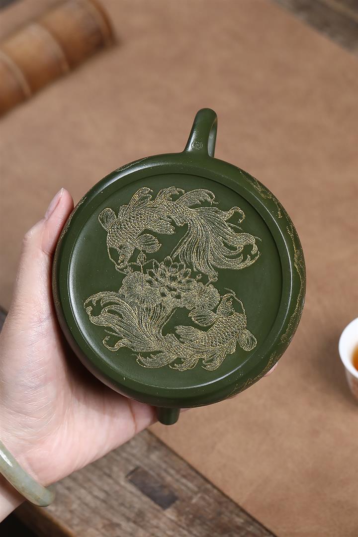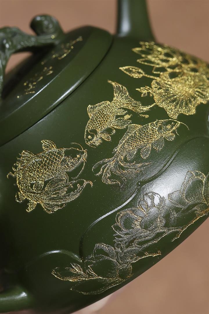 原礦紫泥刻繪金鱗魚罩茶壺POT7027