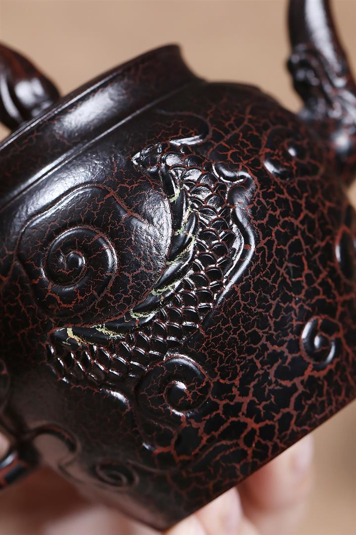 原礦紫泥刻繪金鱗魚罩茶壺POT7027