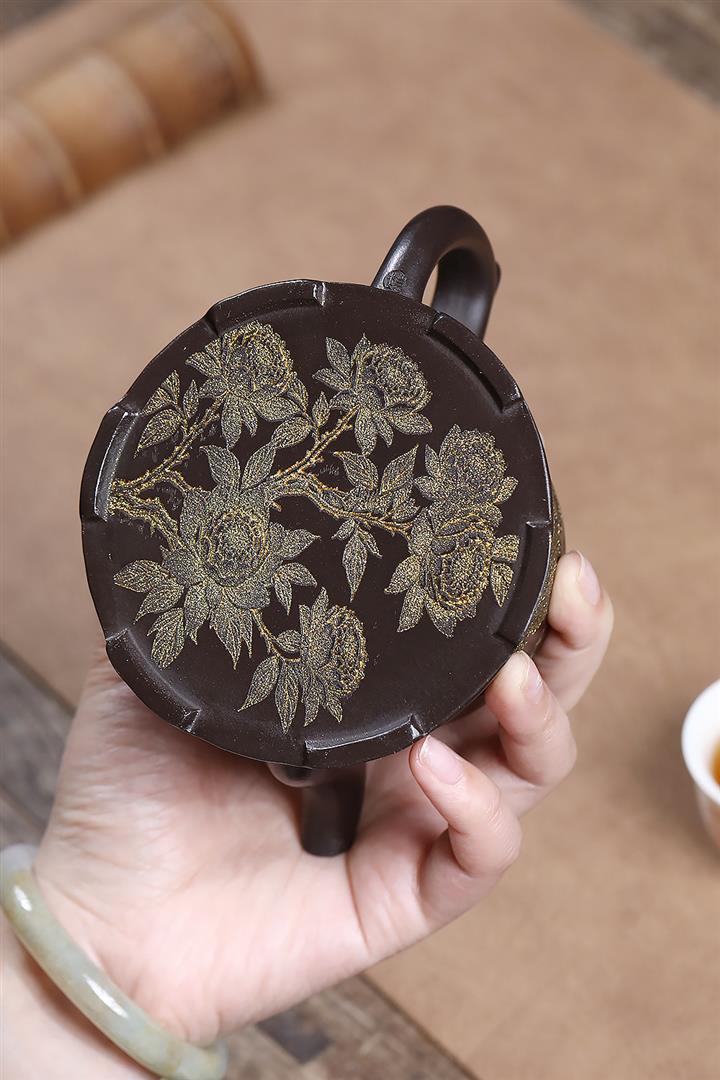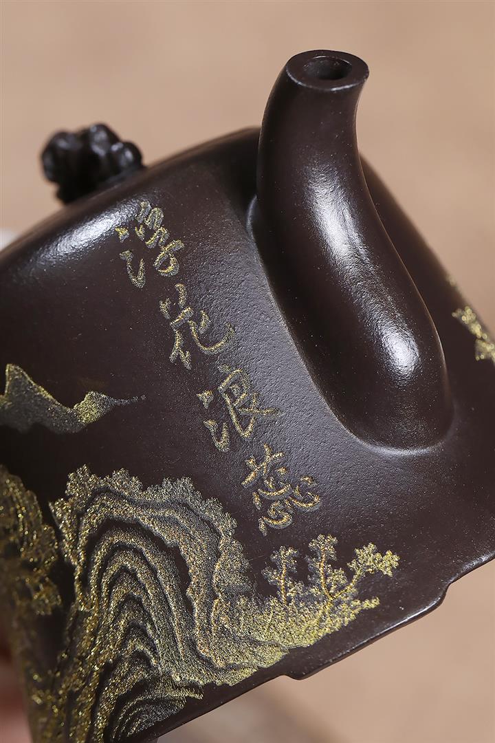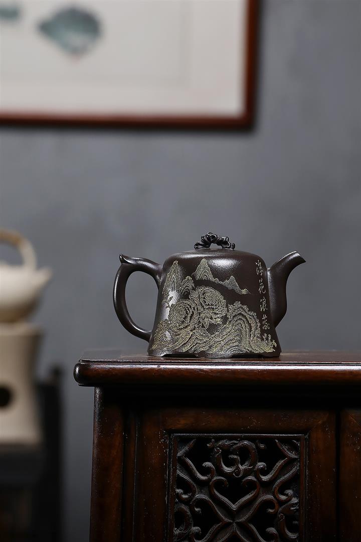 原礦紫泥刻繪金鱗魚罩茶壺POT7027