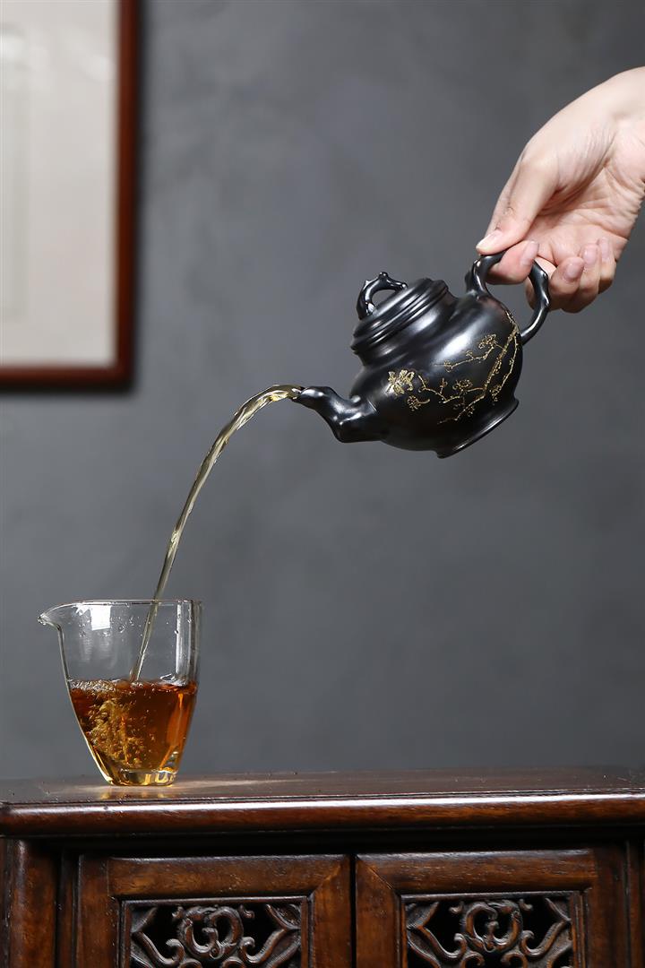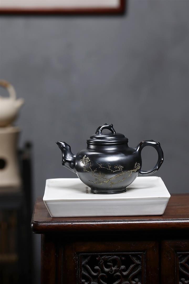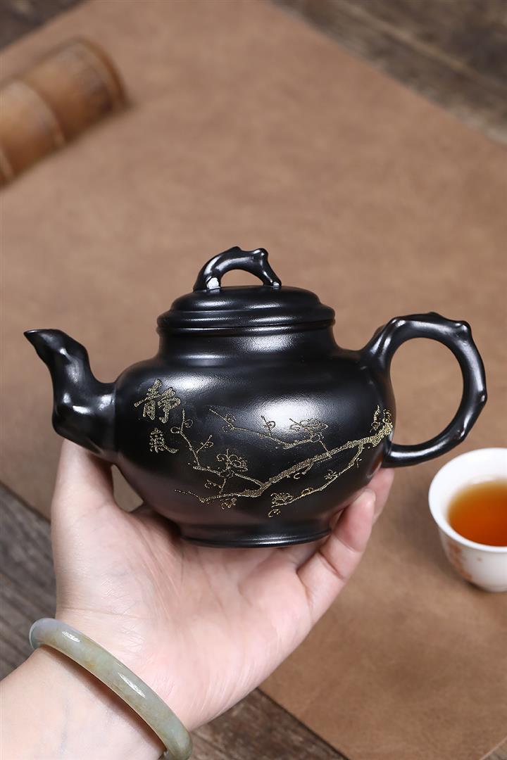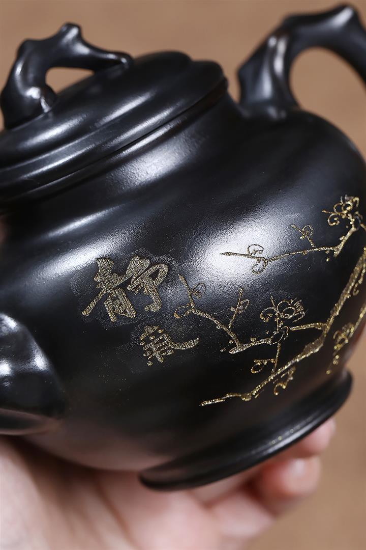 原礦紫泥刻繪金鱗魚罩茶壺POT7027