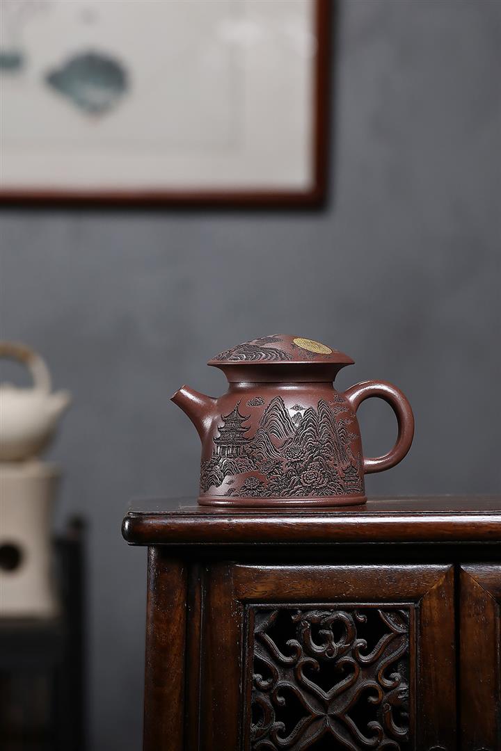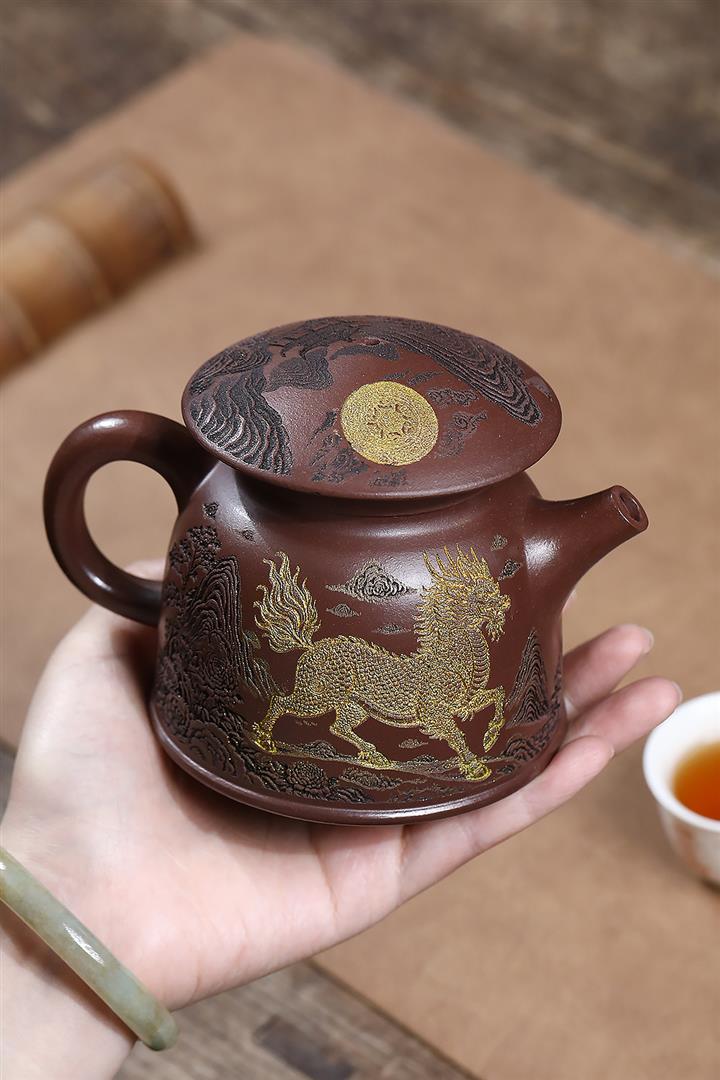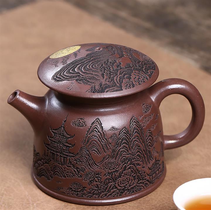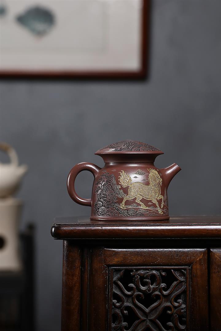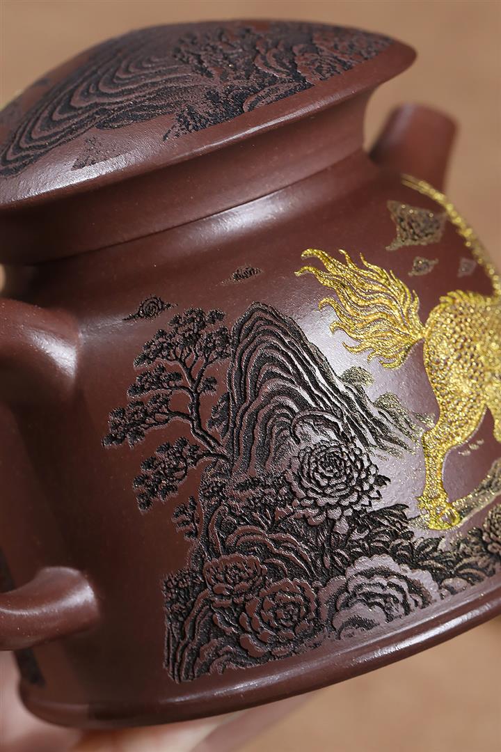 原礦紫泥刻繪金鱗魚罩茶壺POT7027