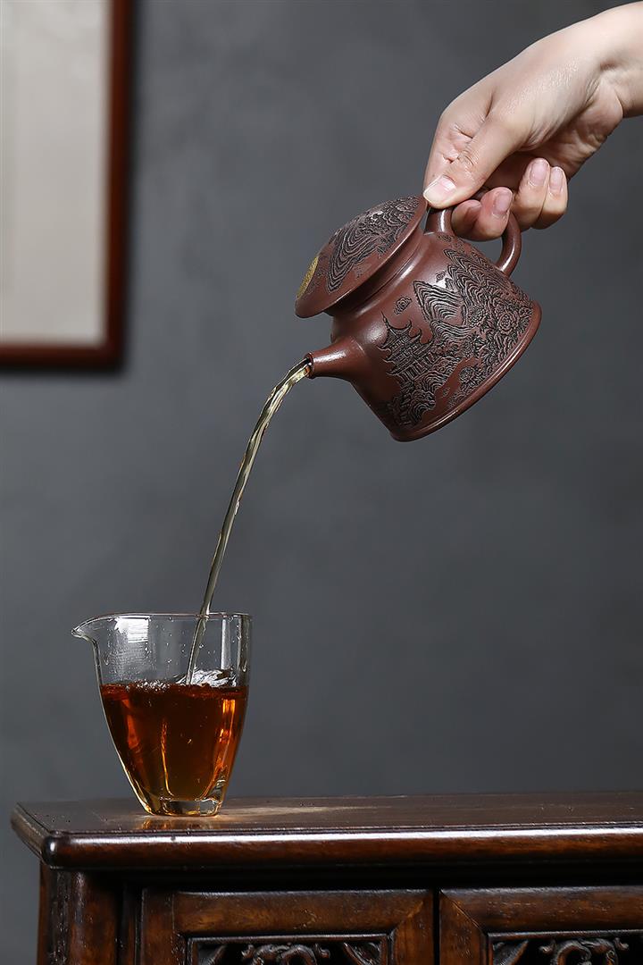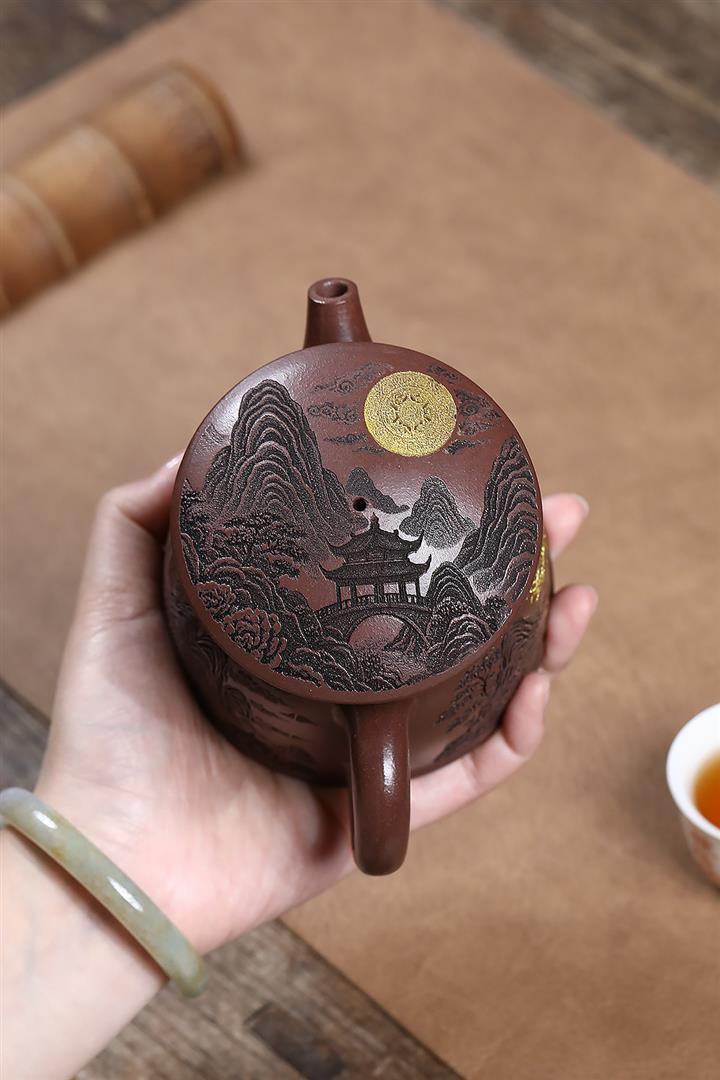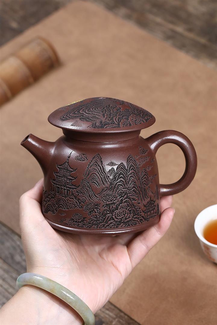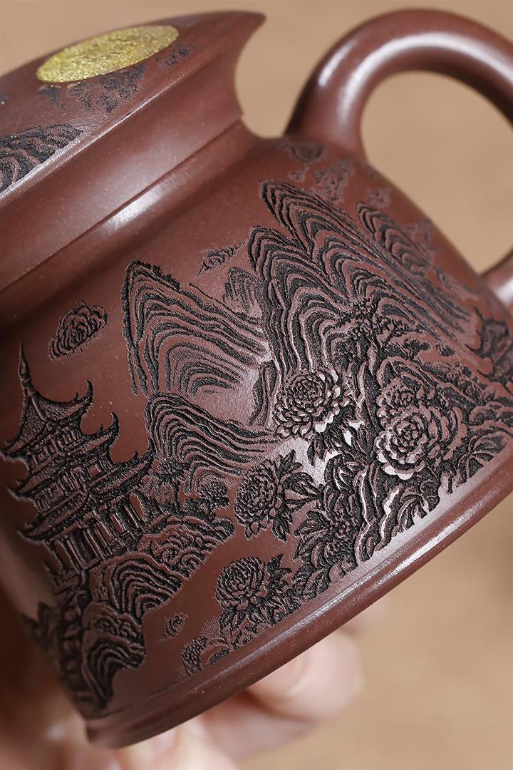 原礦紫泥刻繪金鱗魚罩茶壺POT7027