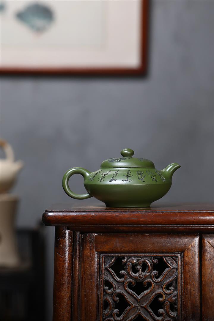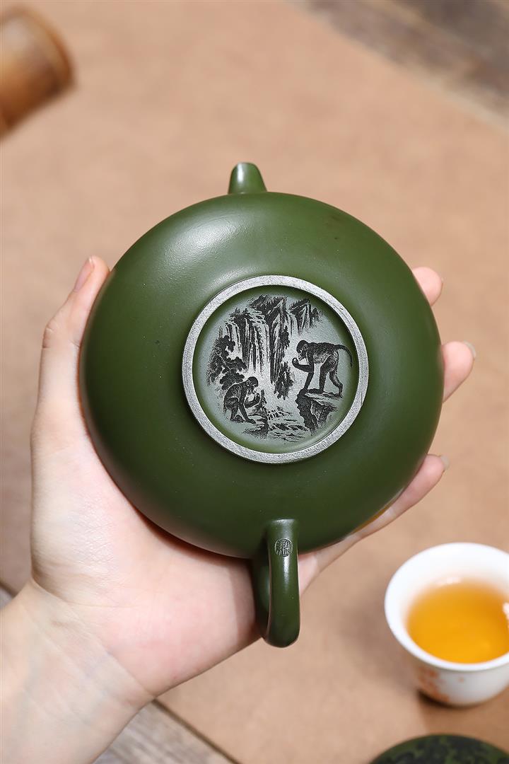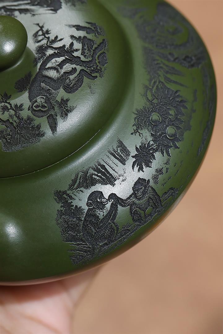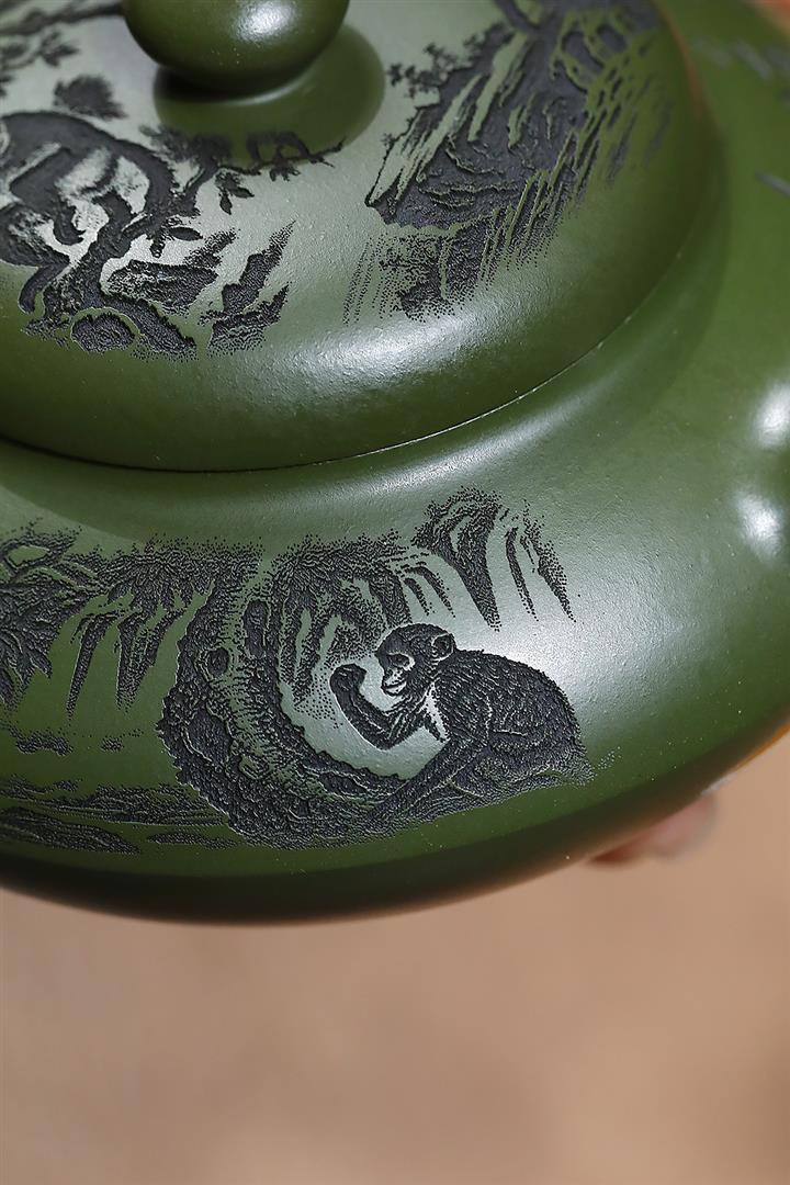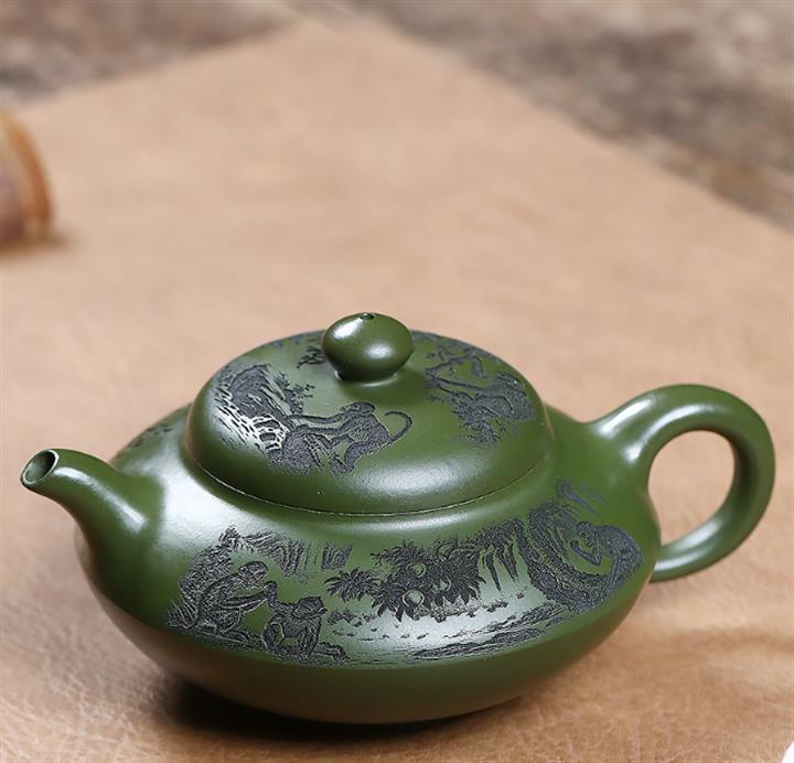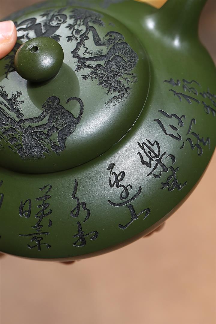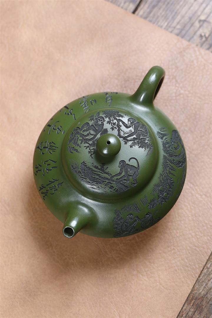 原礦綠泥刻繪猿猴合歡茶壺POT7033