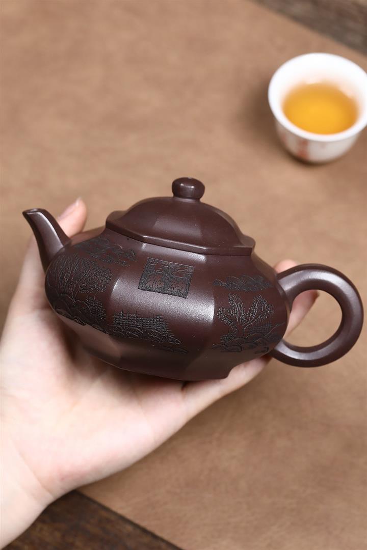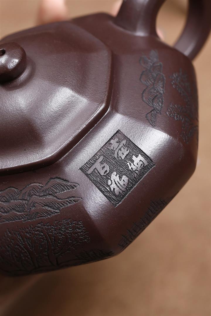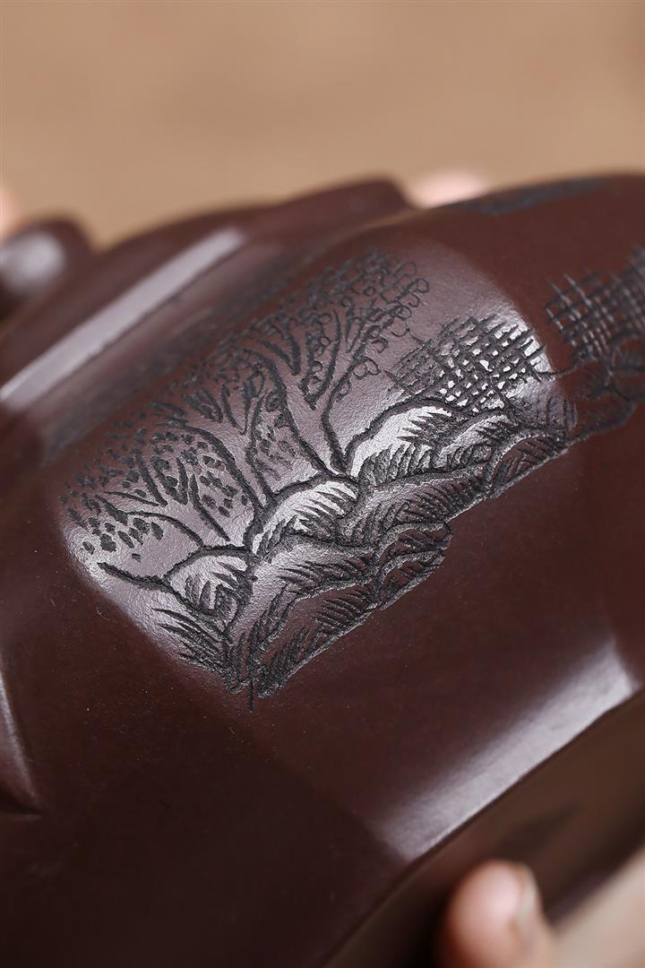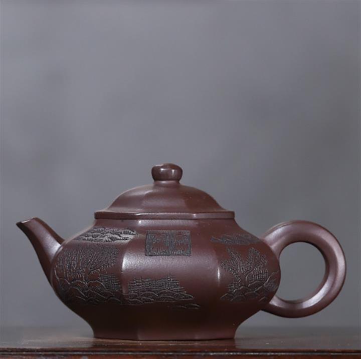 原礦紫泥刻繪山水德鐘茶壺POT7056