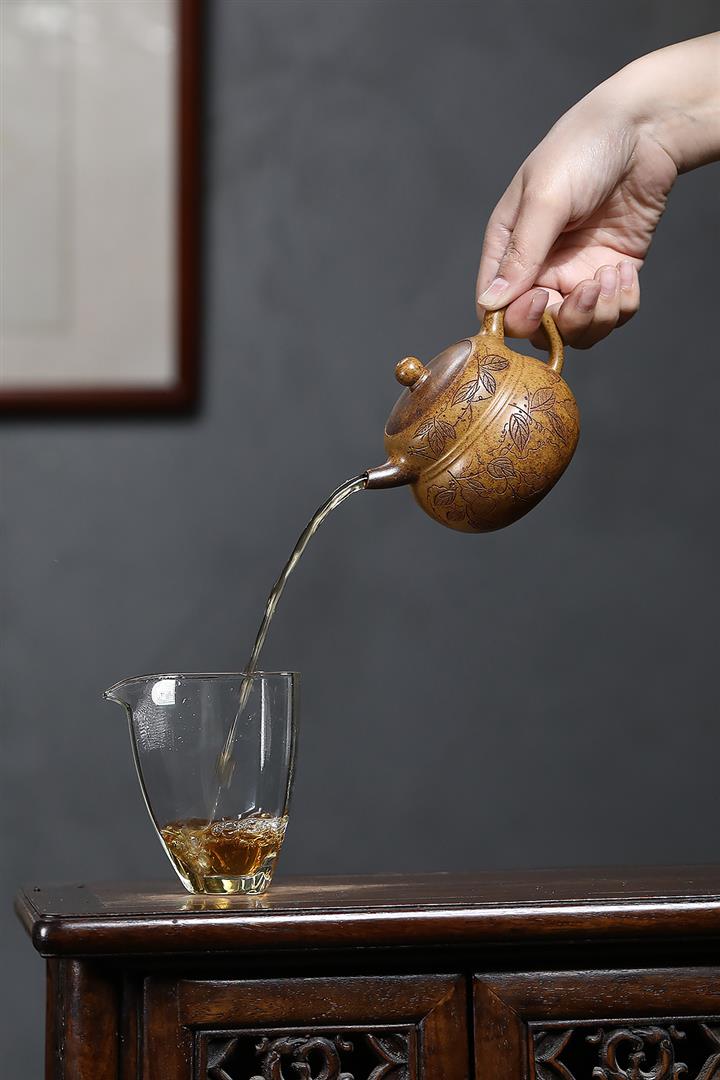 【泥料特點】砂土氣重,似淳實農民,日久使用,漸露鋒芒,養成變化甚大,溫潤莊重。線條優美自然,嘴把搭配協調,身桶配上細長的把搭配,更顯優生動……