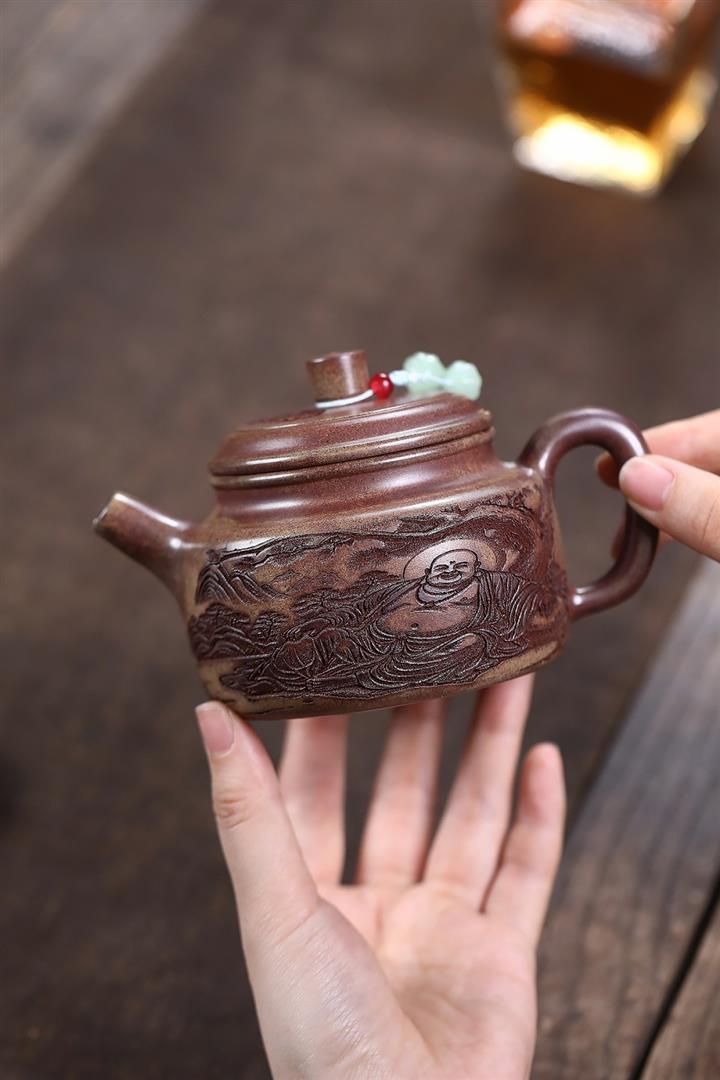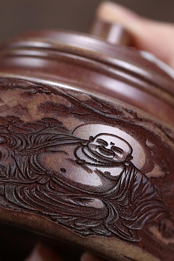 原礦墨綠泥滿刻束腰井欄茶壺POT7171