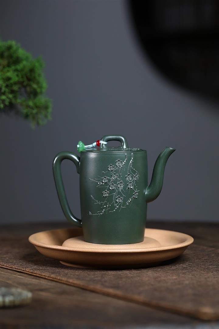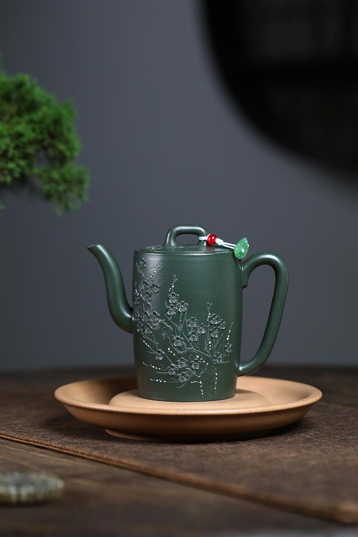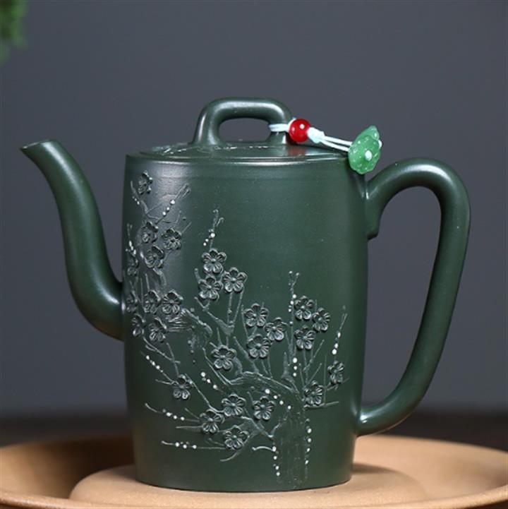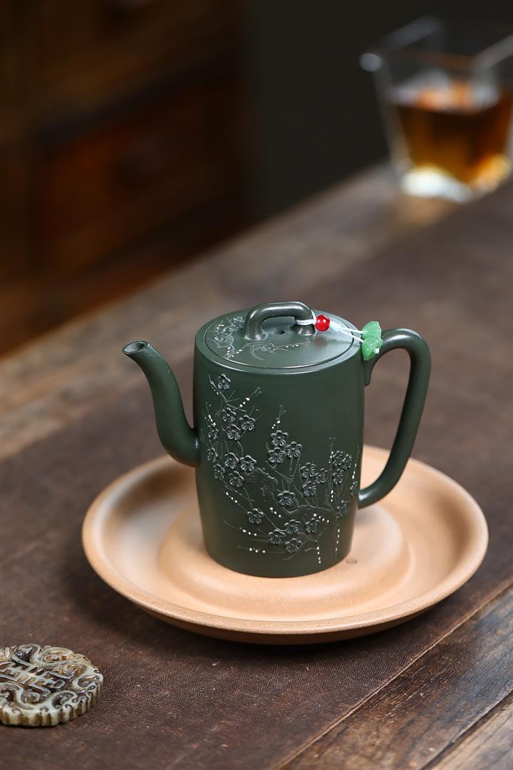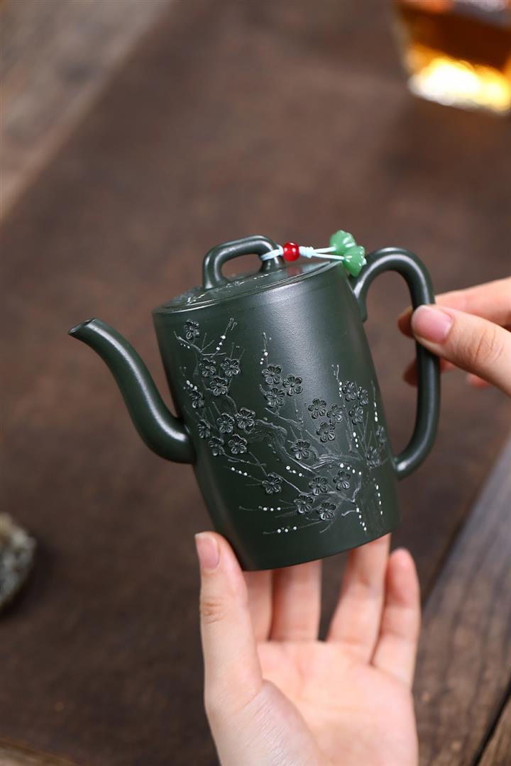 原礦墨綠泥滿刻束腰井欄茶壺POT7171