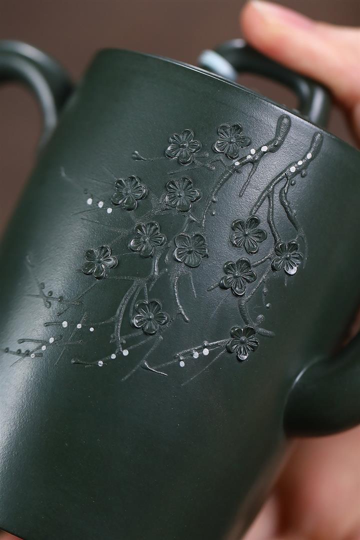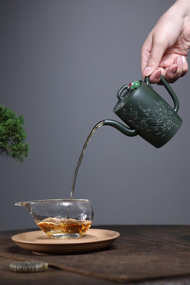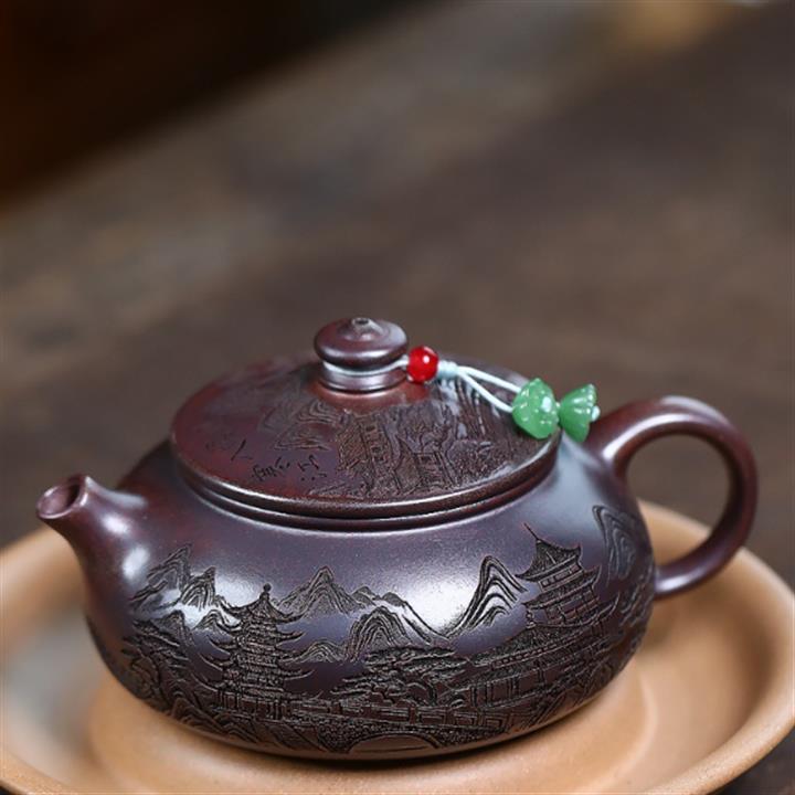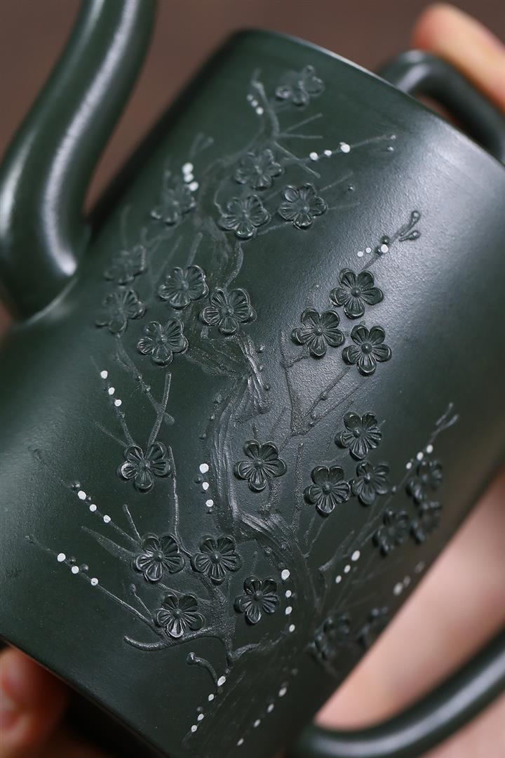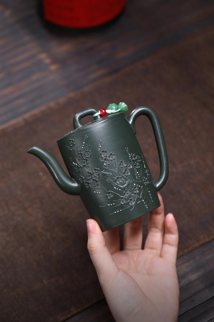 原礦墨綠泥滿刻束腰井欄茶壺POT7171