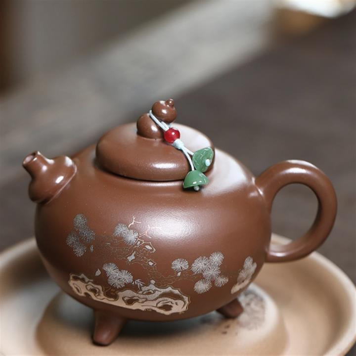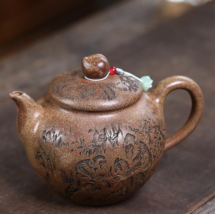 原礦柴燒開花泥滿刻壽桃壺POT7175