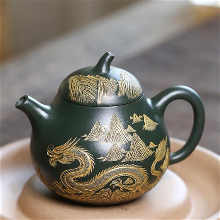 原礦墨綠泥金龍茄瓜茶壺POT7177
