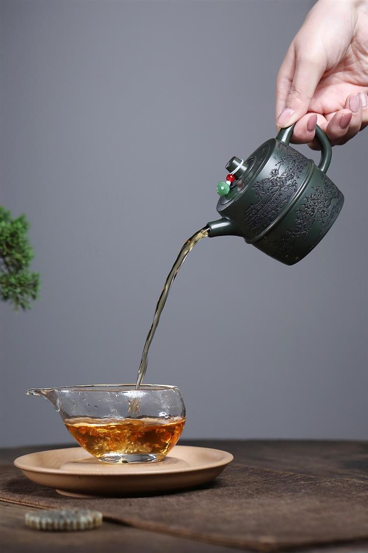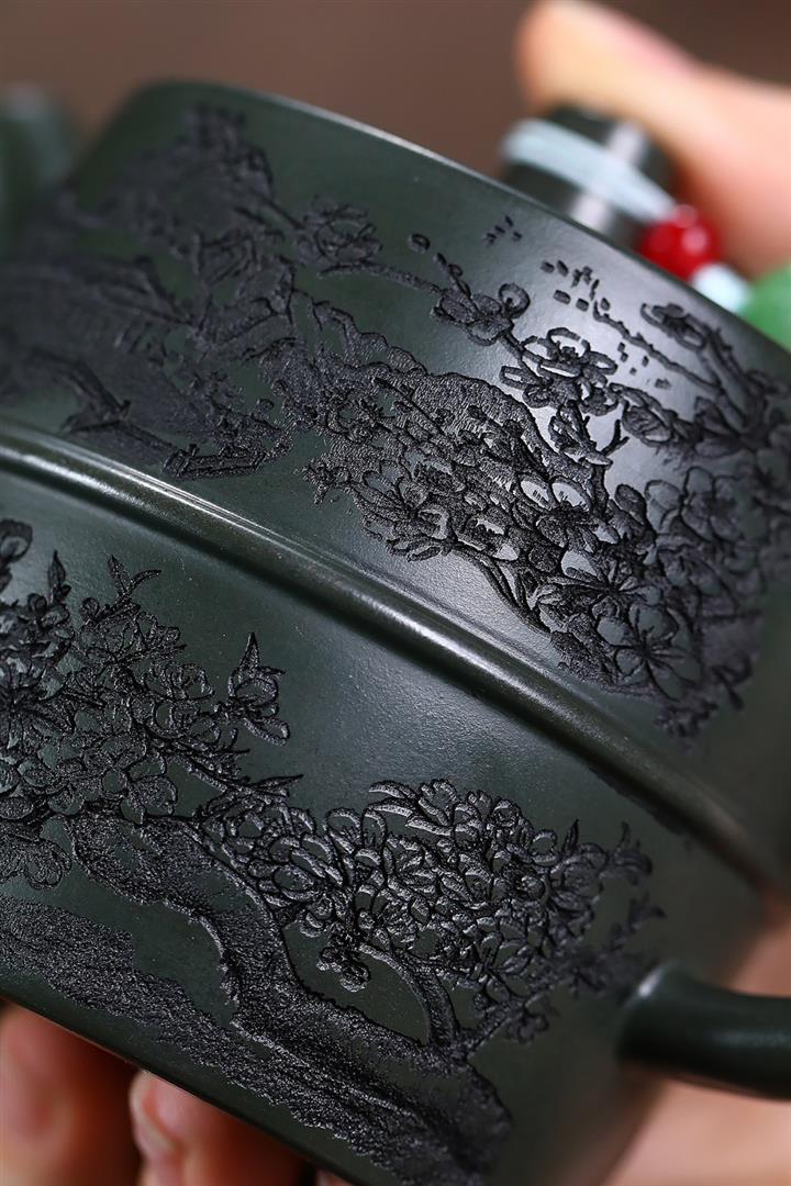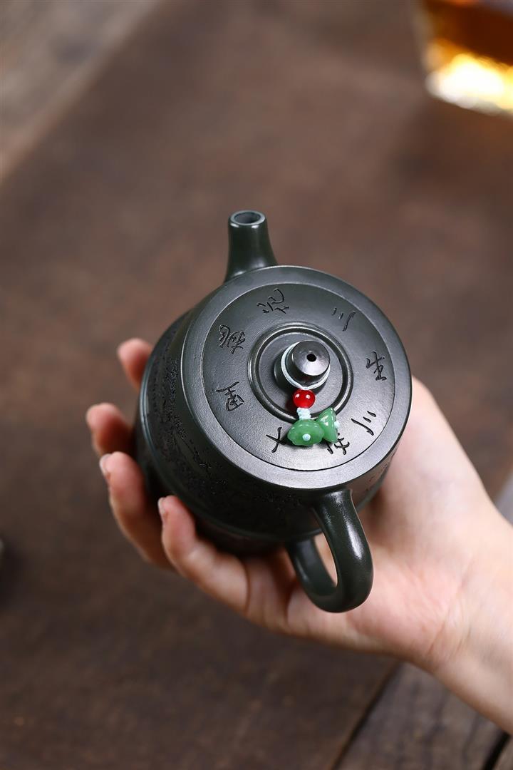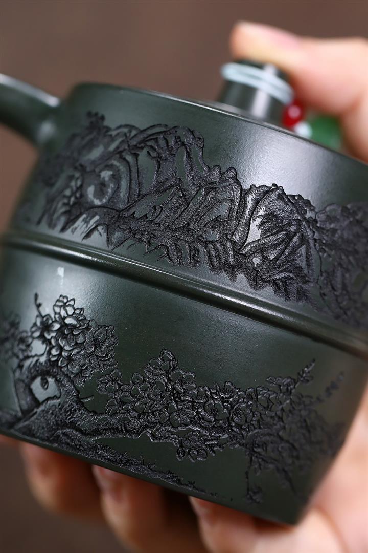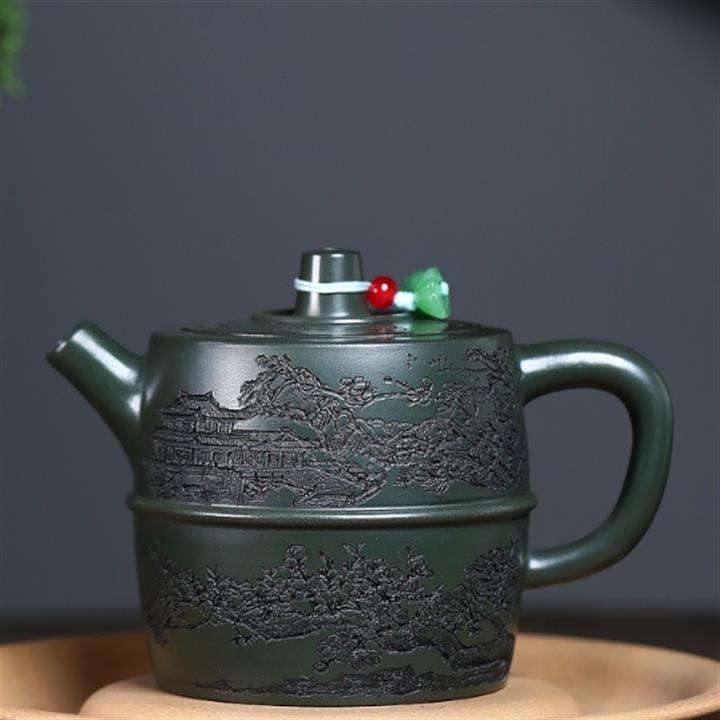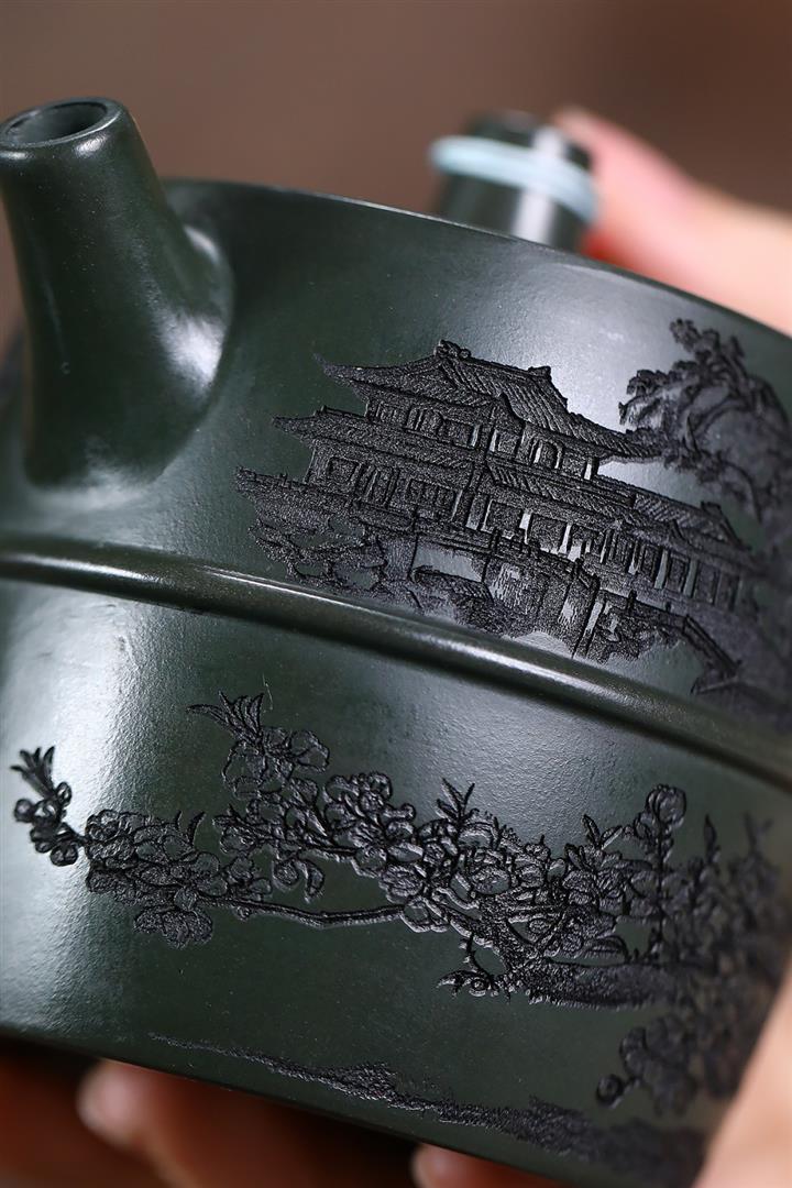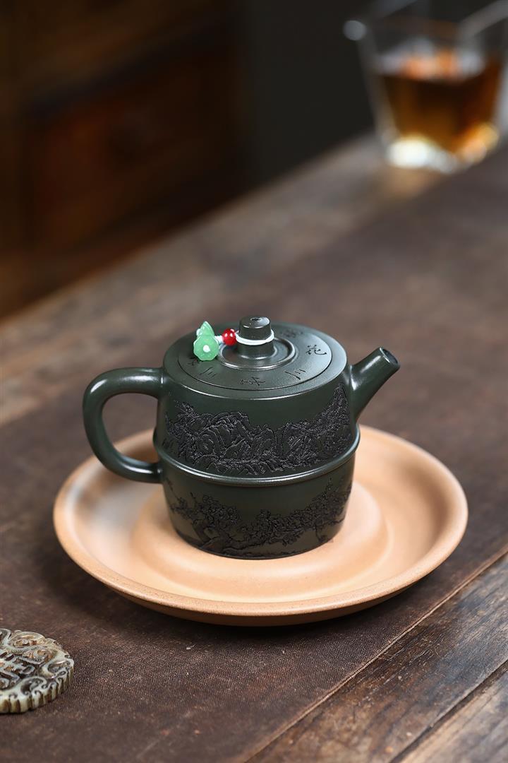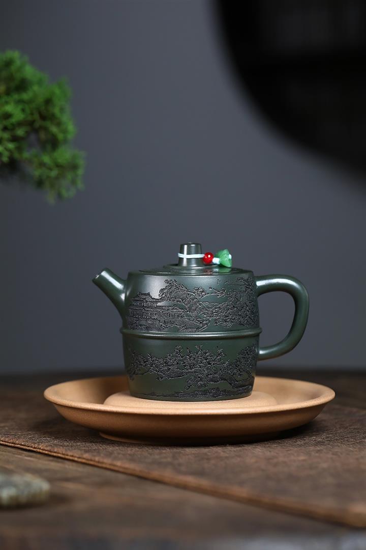 原礦墨綠泥滿刻束腰井欄茶壺POT7171