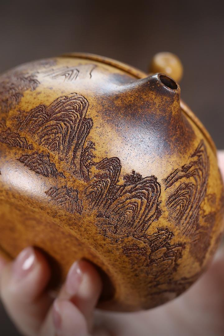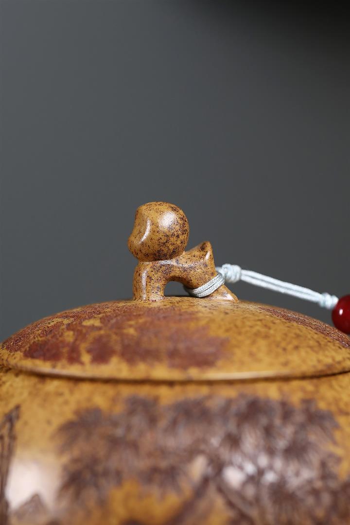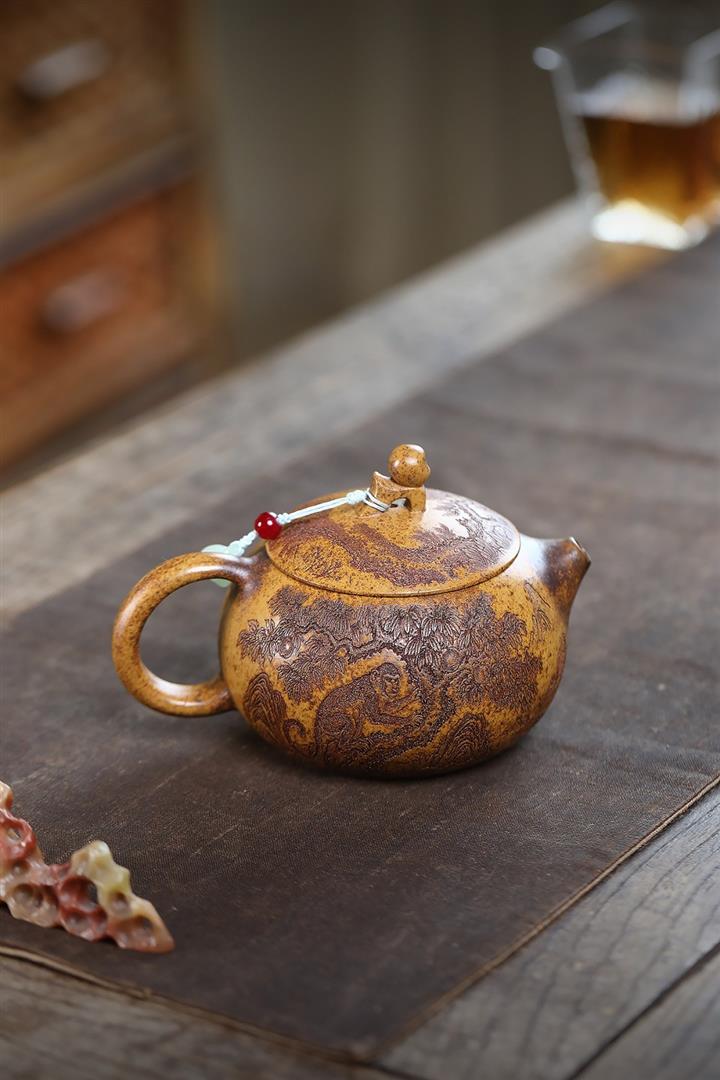 原礦紅皮龍滿刻山水漢瓦茶壺POT7226
