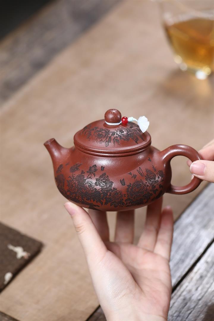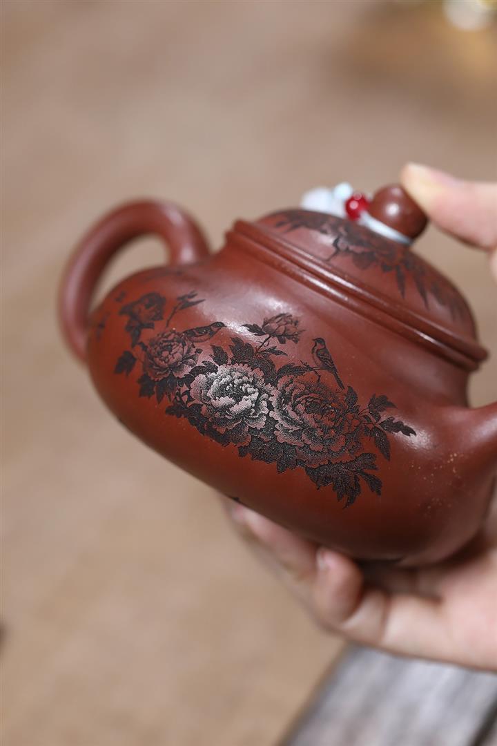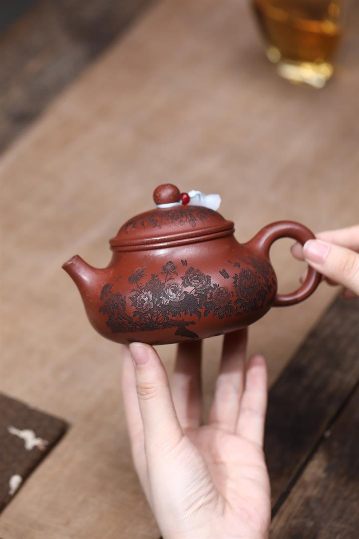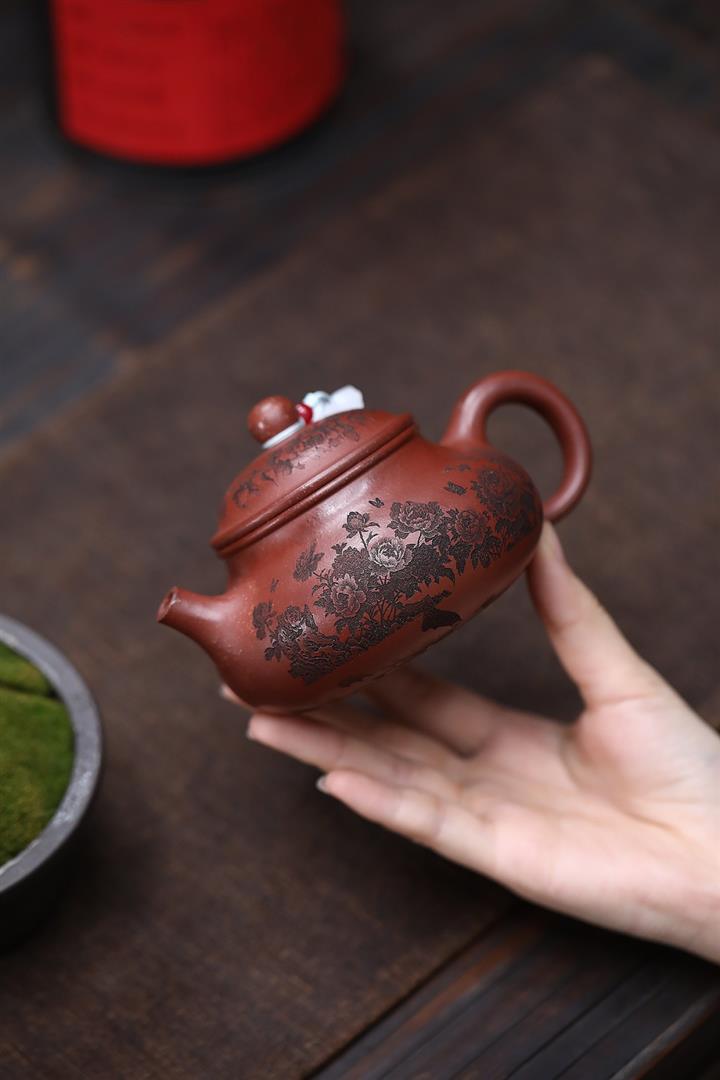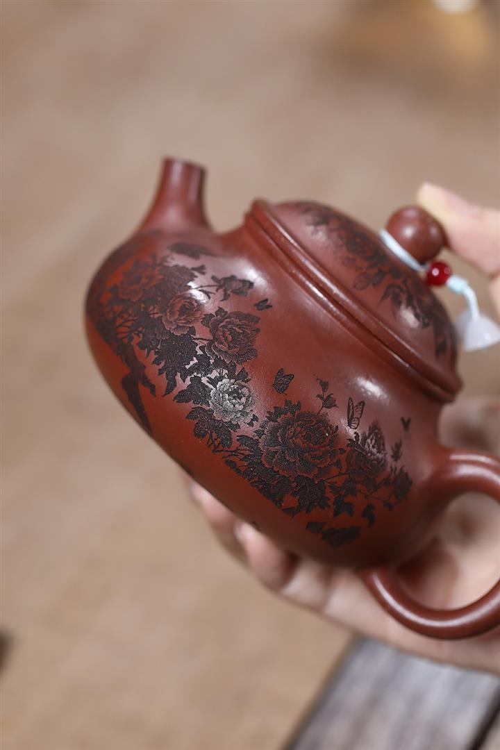 原礦家藏降坡泥滿刻牡丹容天茶壺POT7241
