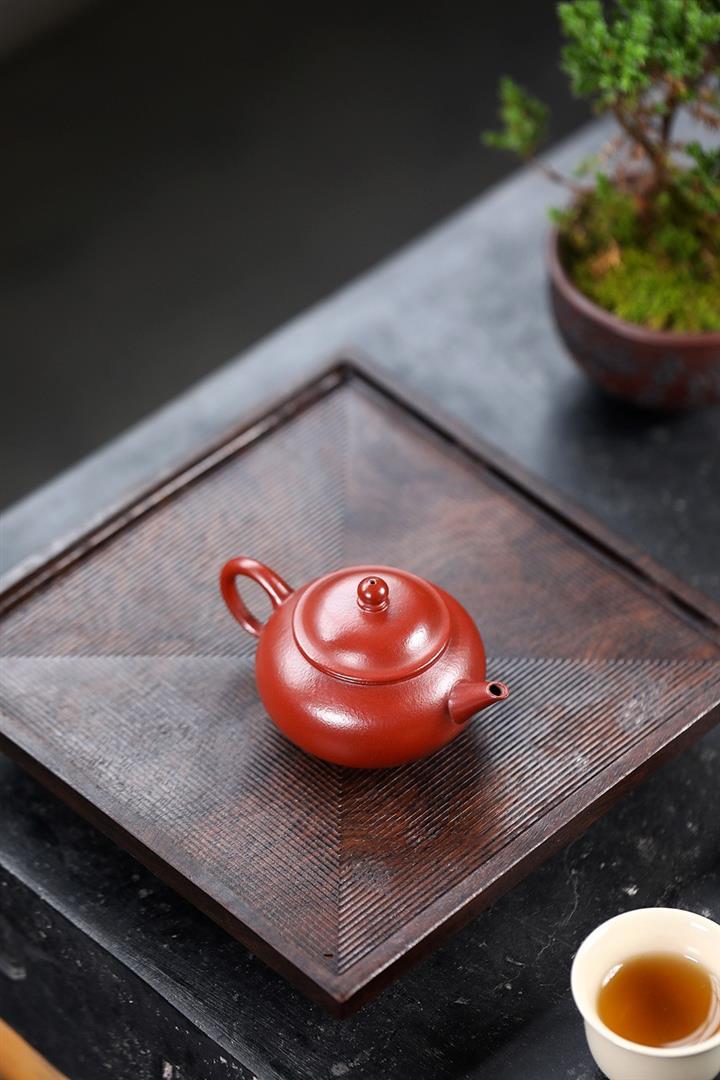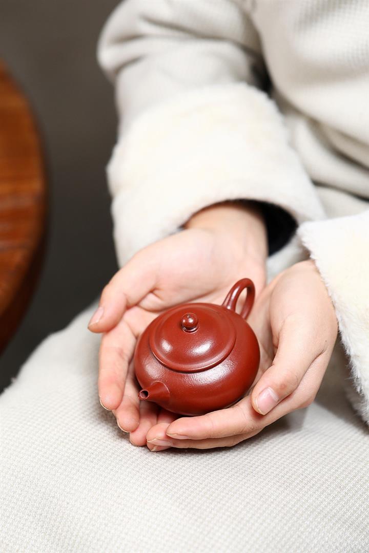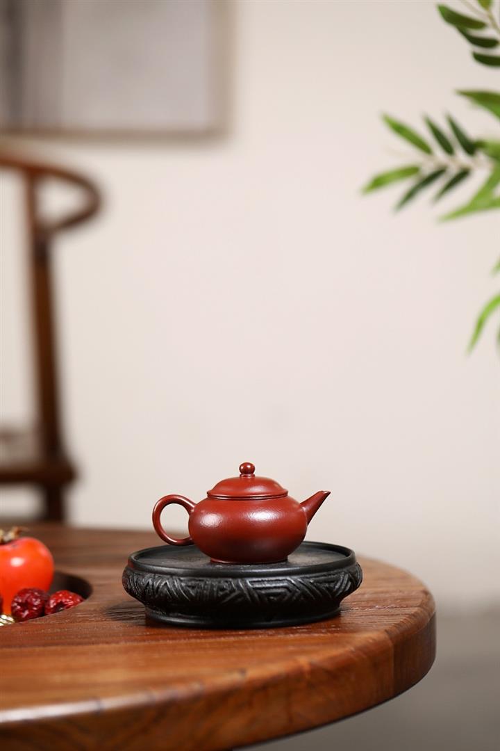壺蓋隆起,飽滿有張力,底部圈足大小和壺口接近,既是呼應也是對稱。壺身飽滿圓潤,和圓珠壺鈕相互呼應,相得益彰。