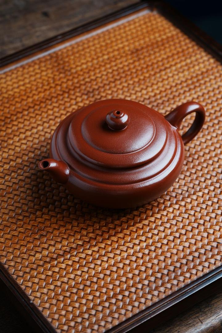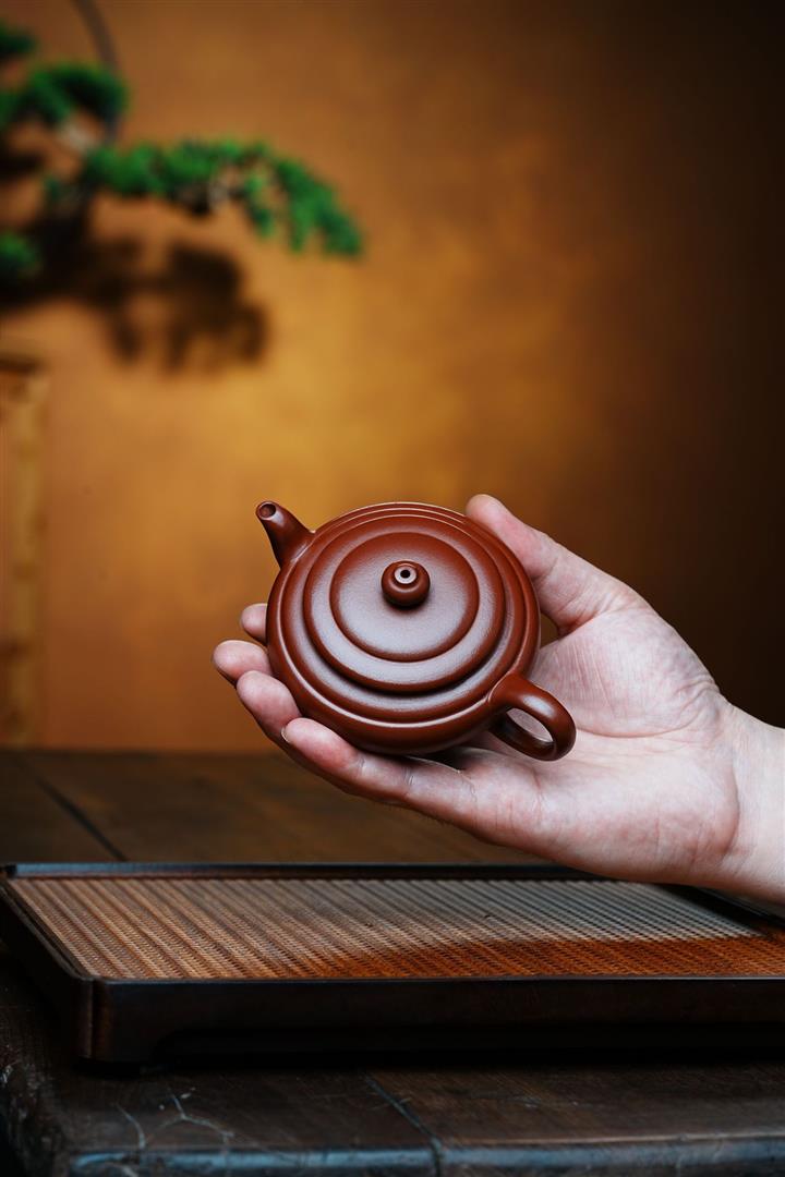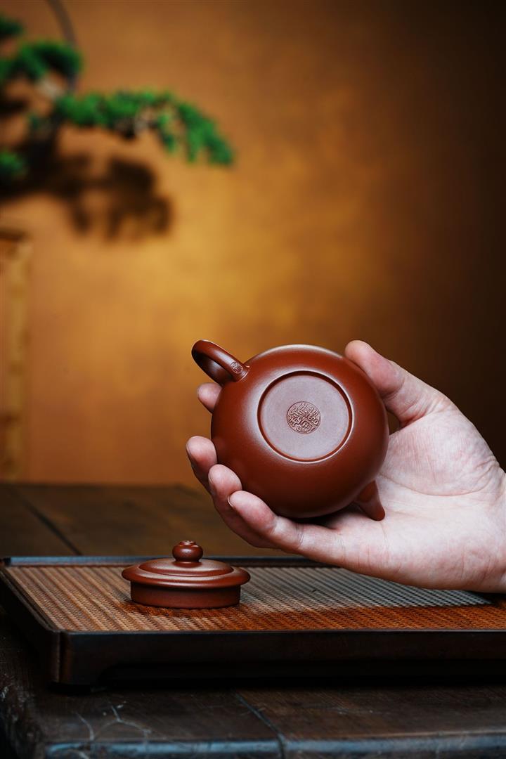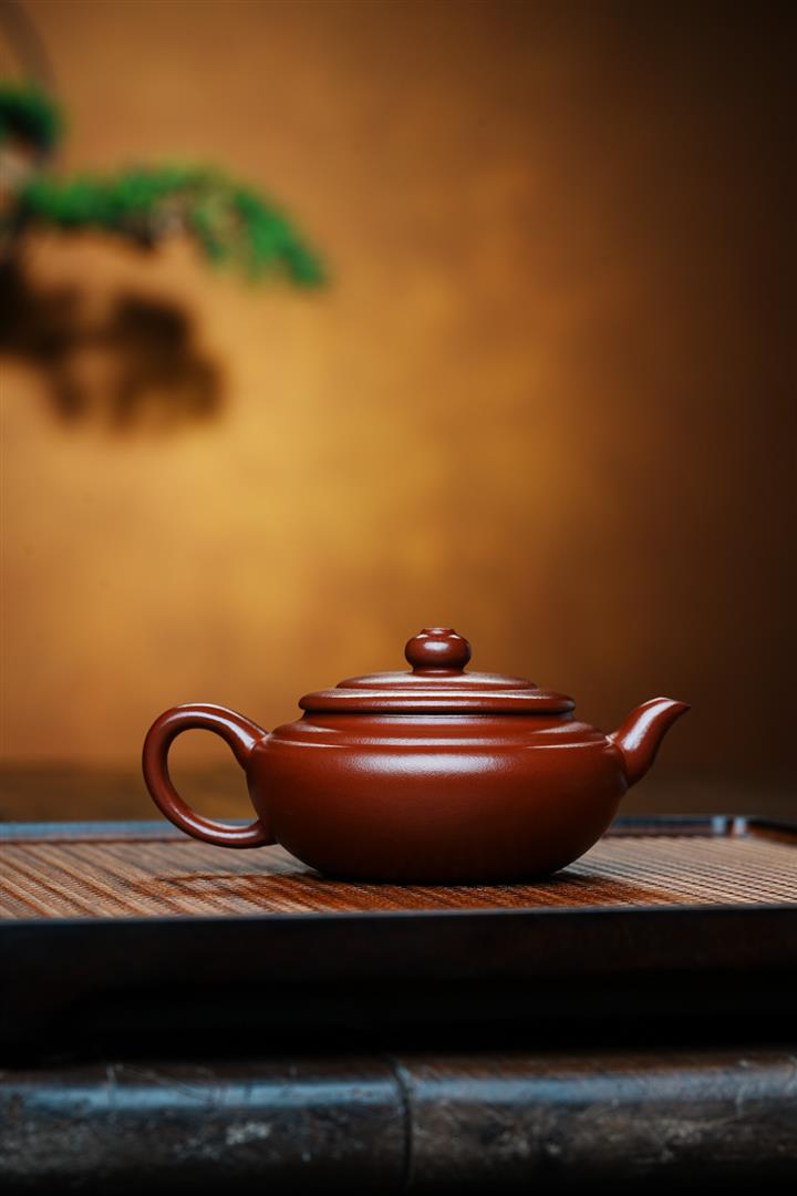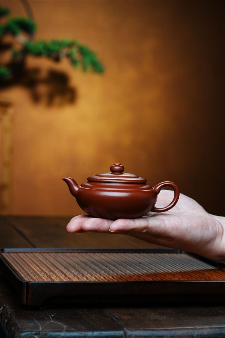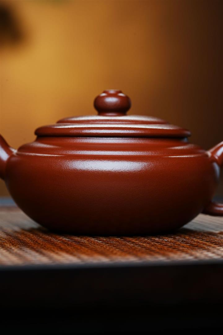 此壺為紫砂經典器型之壹,造型古樸,氣韻生動。壺體扁平碩大,渾厚華滋,線條流暢自然,直嘴前沖,曲線優美,壺把自由舒展,飄逸放達,壺口平滑,壺鈕呈圓球狀,小巧可愛,拿捏便利,整器做工精湛,泥料精致細膩,色澤更是靚麗典雅,令人喜愛。