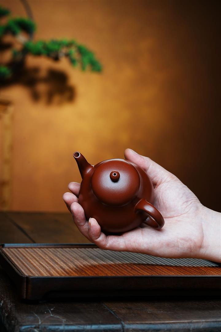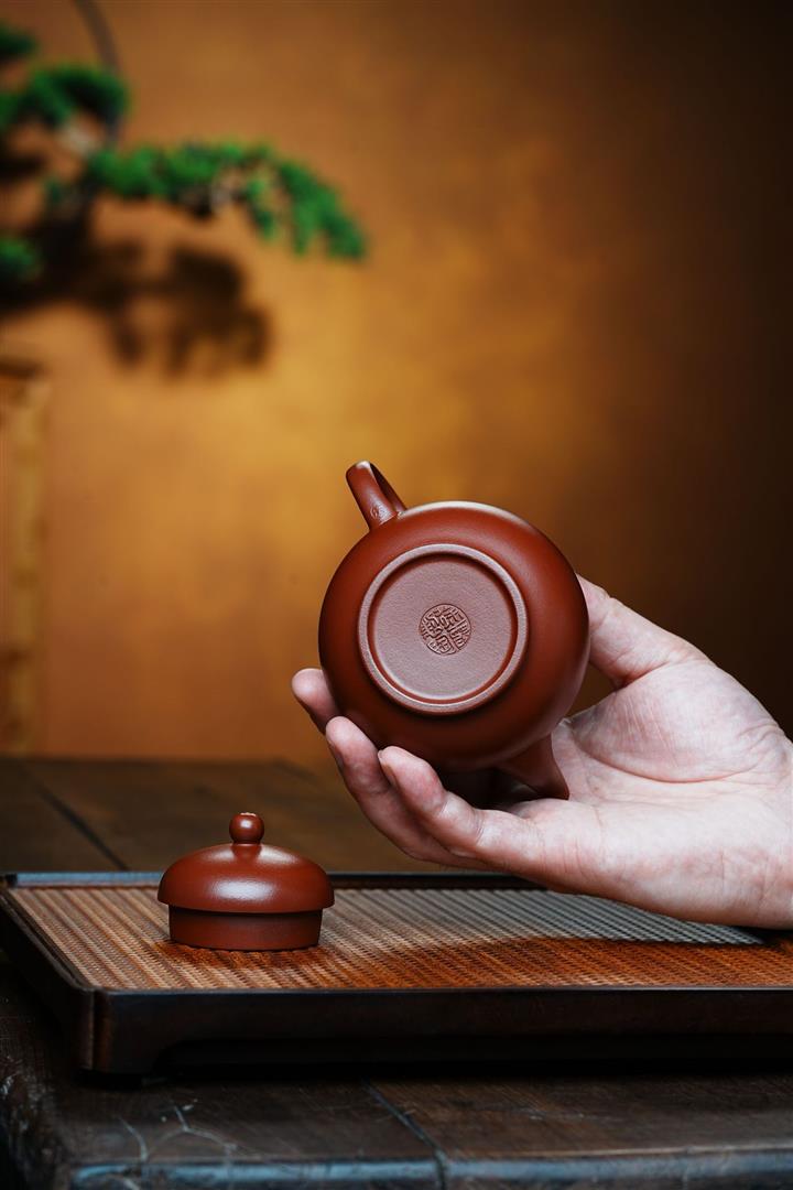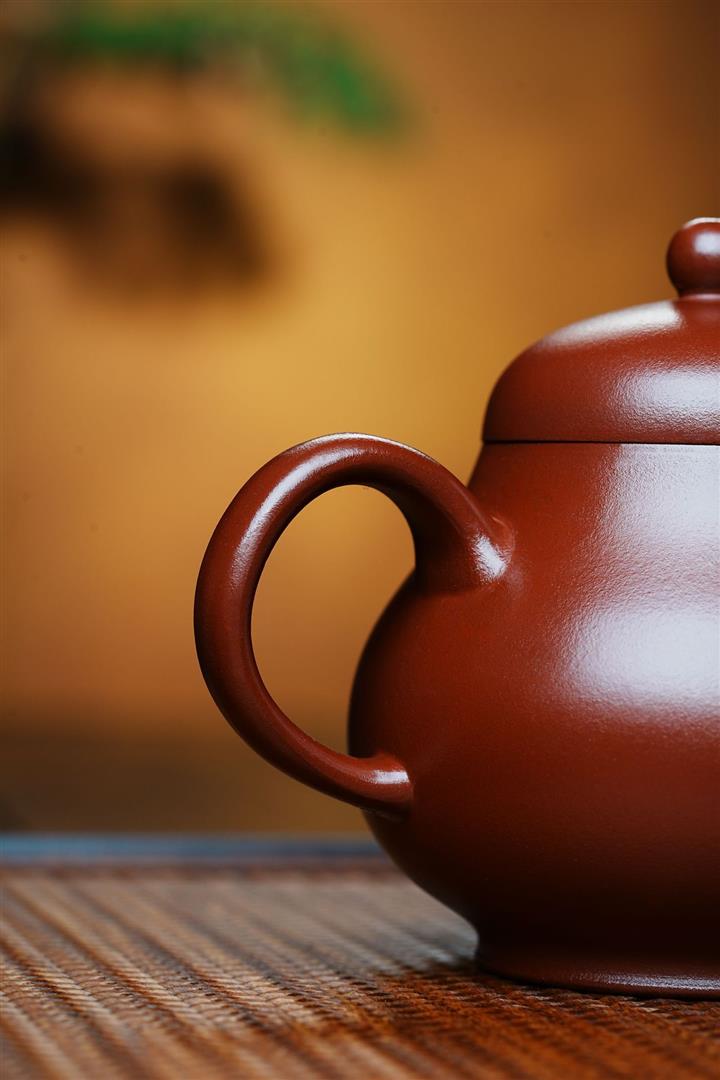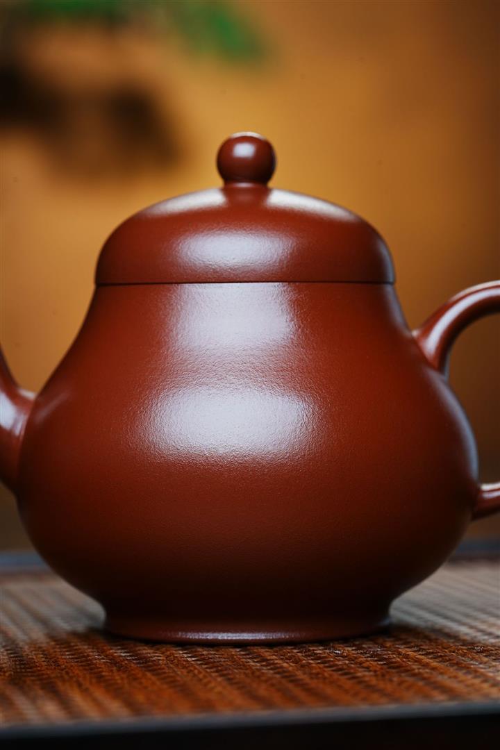 此壺為紫砂經典器型之壹,造型古樸,氣韻生動。壺體扁平碩大,渾厚華滋,線條流暢自然,直嘴前沖,曲線優美,壺把自由舒展,飄逸放達,壺口平滑,壺鈕呈圓球狀,小巧可愛,拿捏便利,整器做工精湛,泥料精致細膩,色澤更是靚麗典雅,令人喜愛。