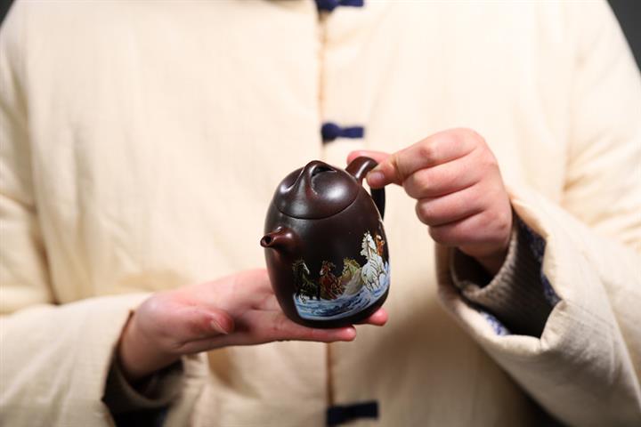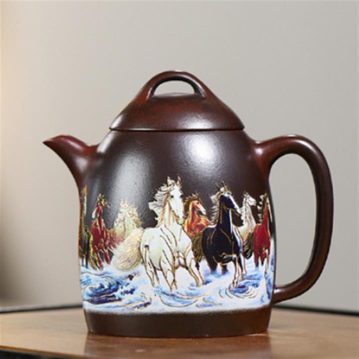 【簡介】此壺整體造型古樸簡練又不失大方。壺身高聳,由下至上收斂,自然流暢,流短有勁,環耳形把手,不矯不揚。截蓋微鼓,壺身與壺蓋混為壹體。如此器形簡單、大氣,大開大合之間見其力度。 泥繪的八匹英姿勃勃的駿馬飛奔向前,姿態各異,匹匹高在雄健、精神煥發。