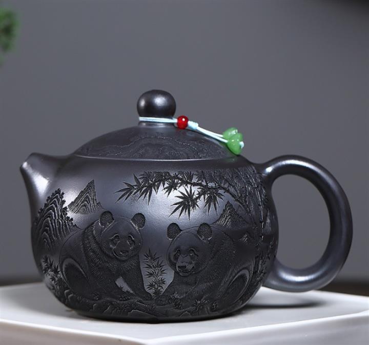 原礦石黃泥滿刻熊貓西施茶壺POT7412