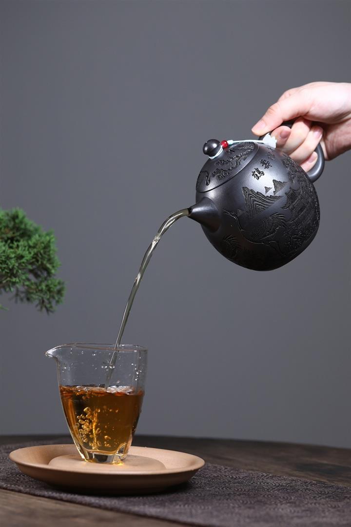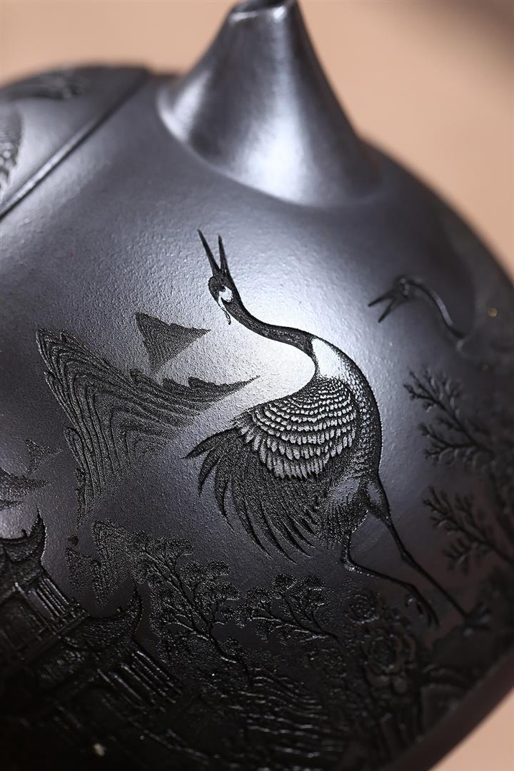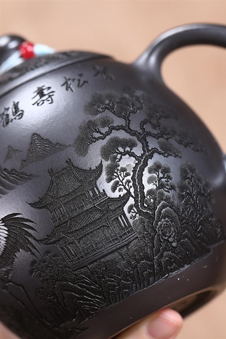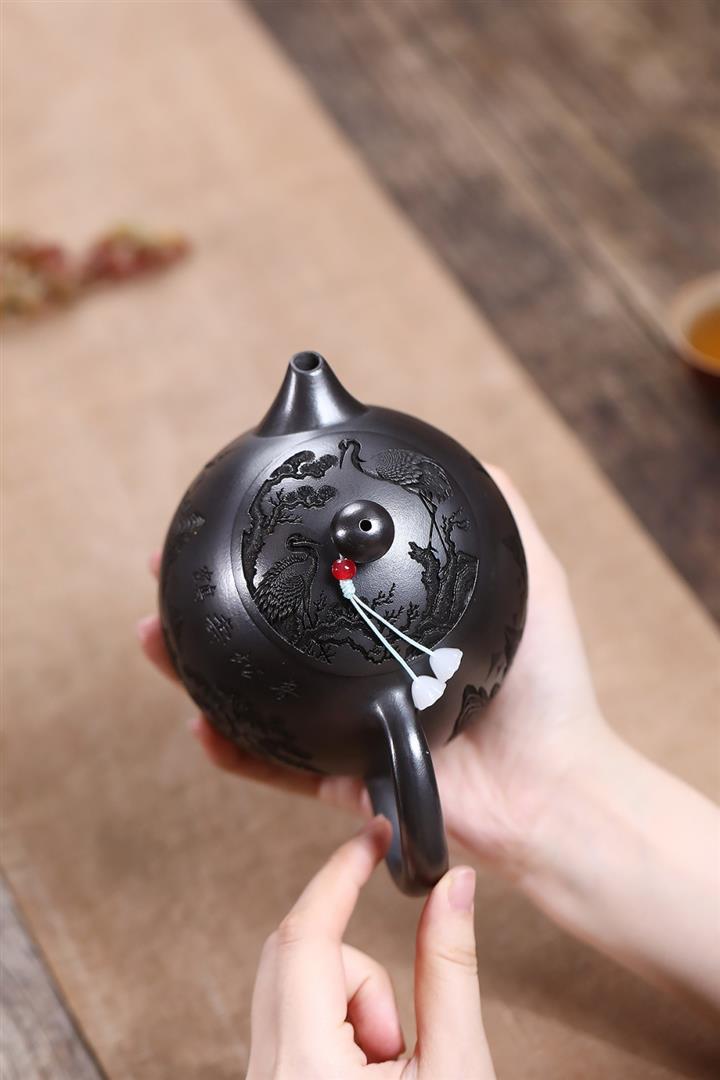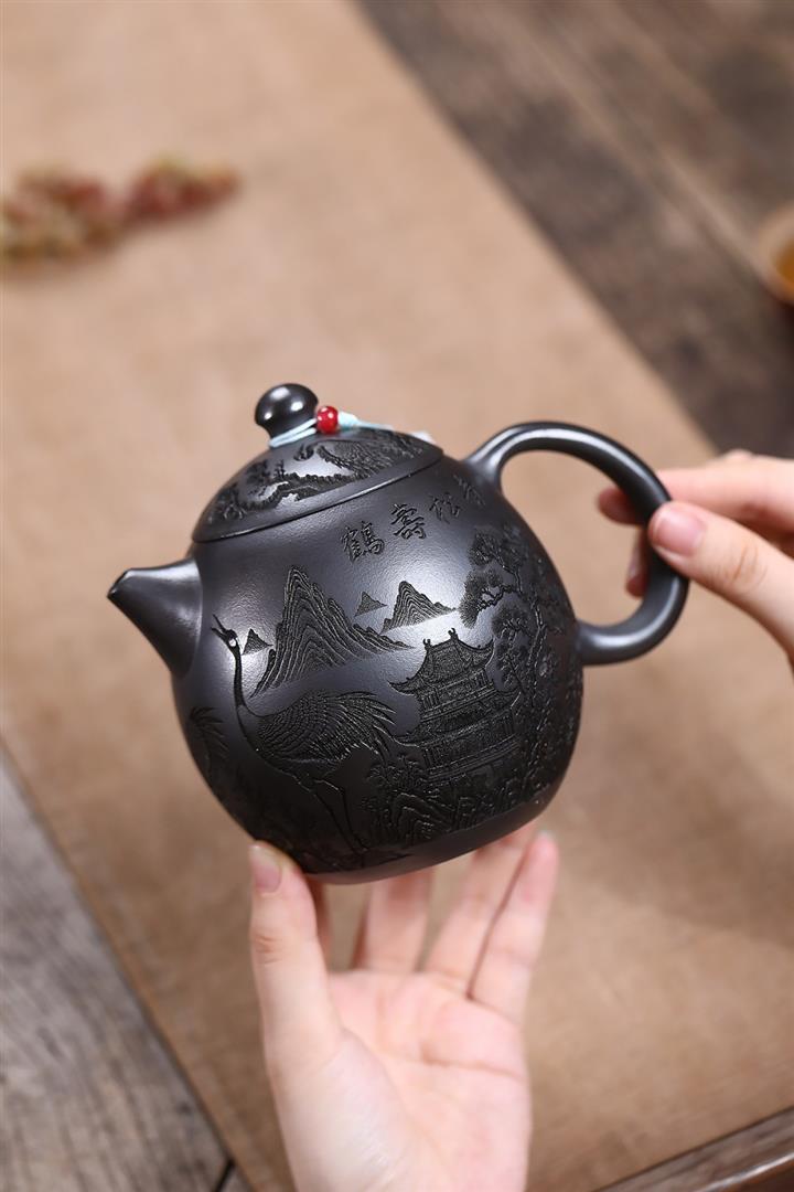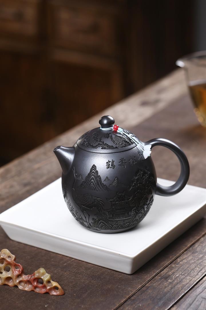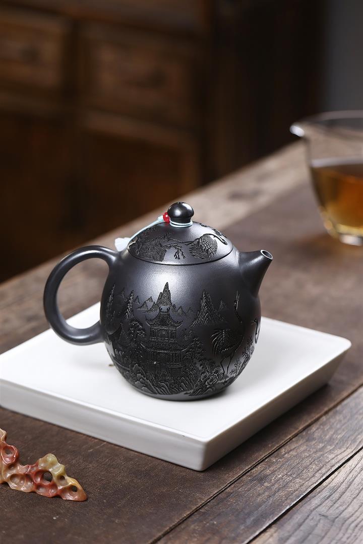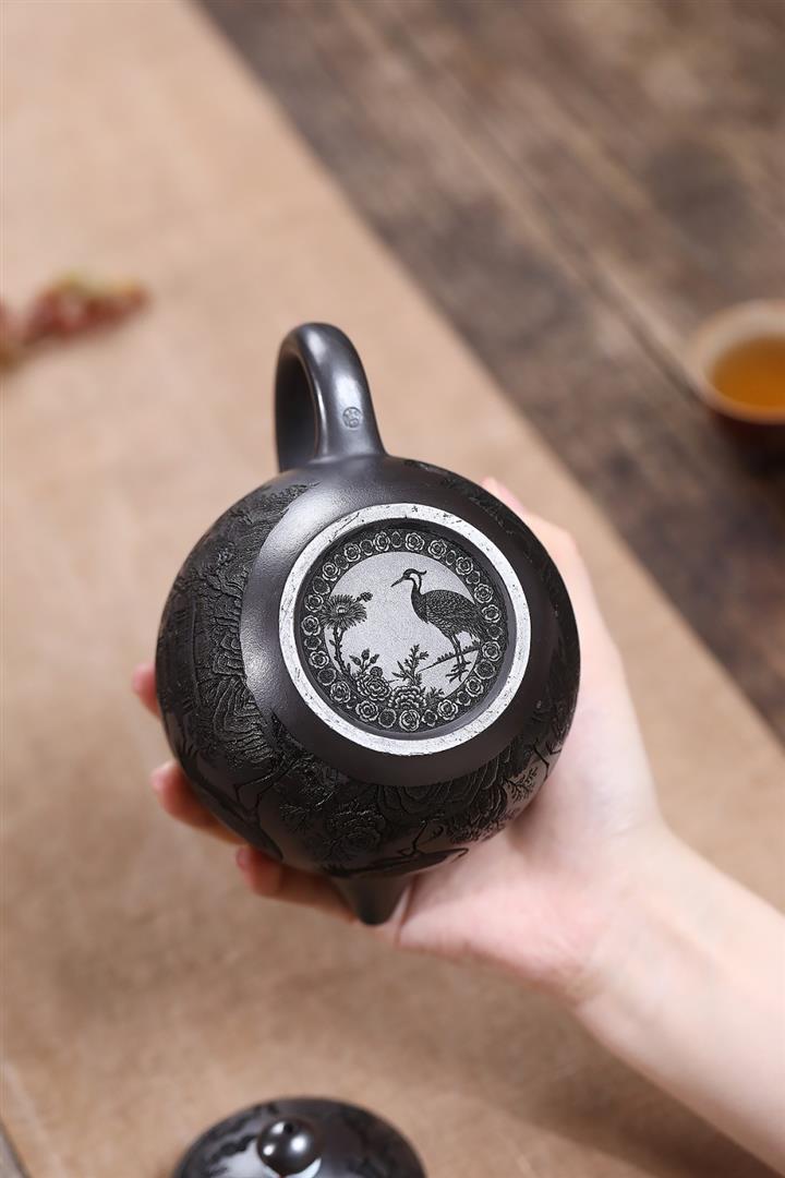 原礦石黃泥滿刻仙鶴龍蛋茶壺POT7409