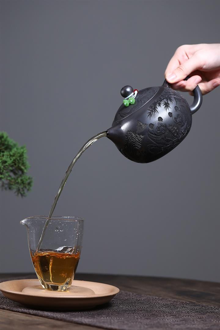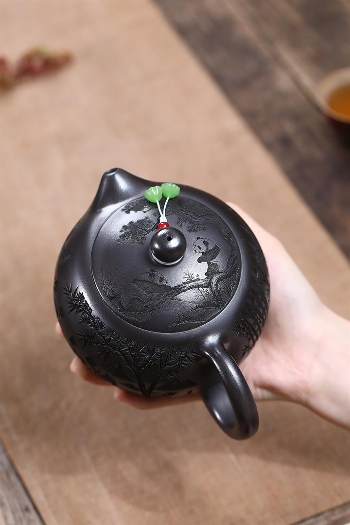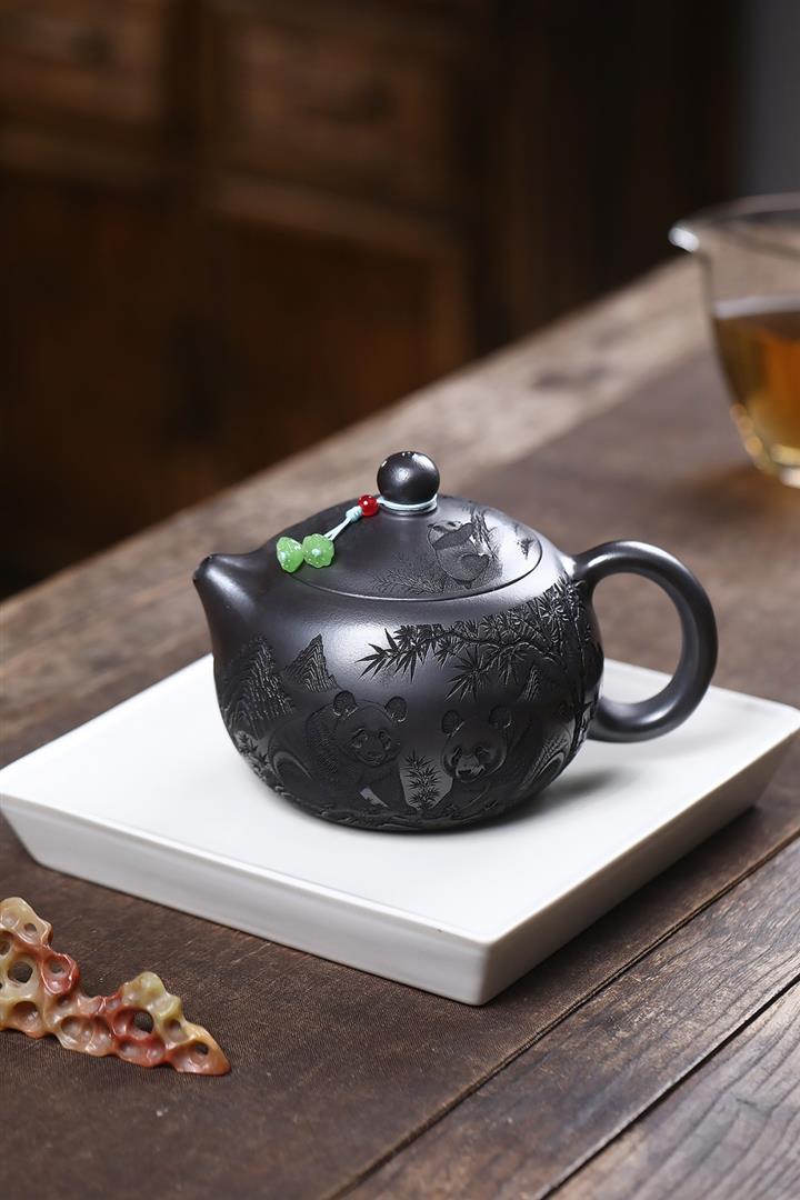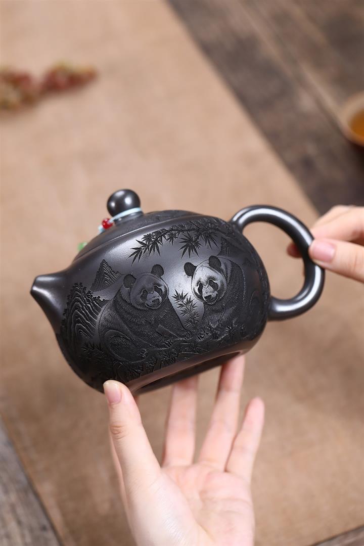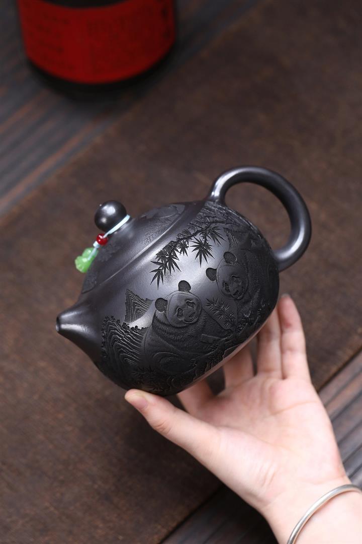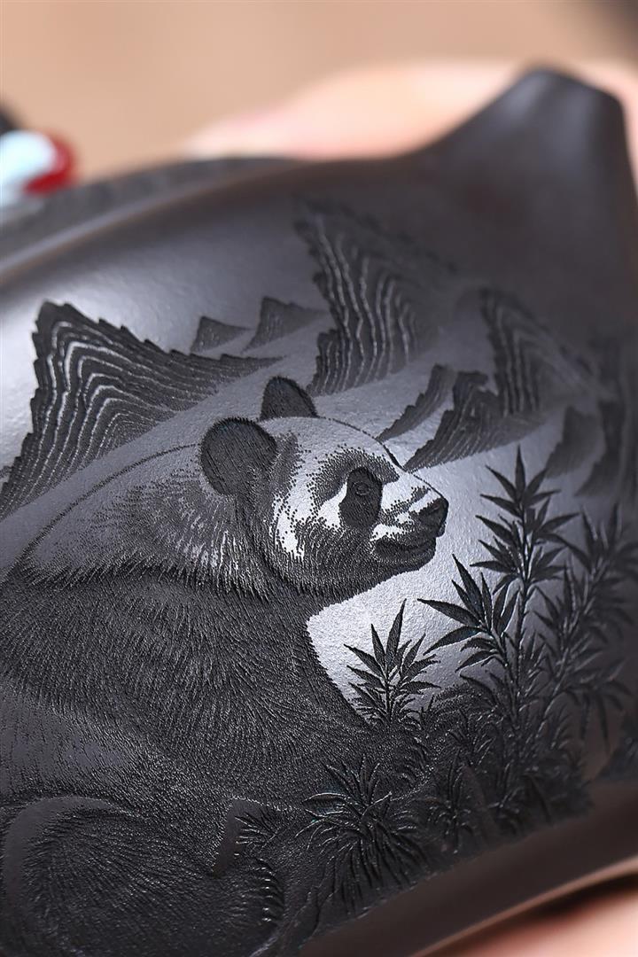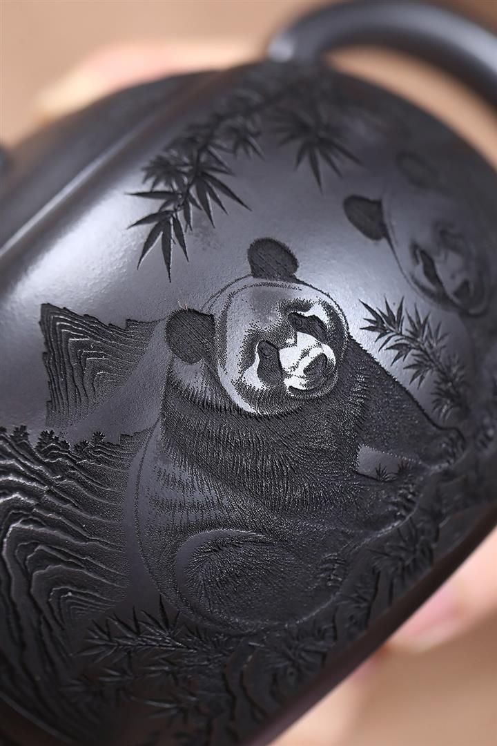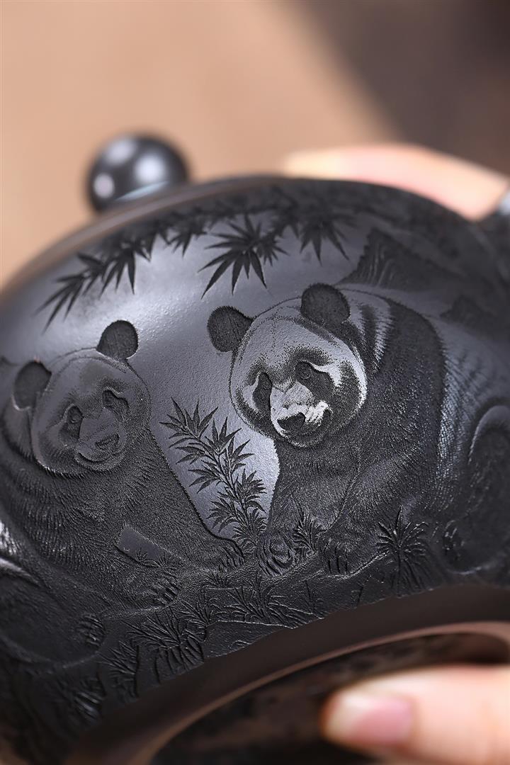 原礦石黃泥滿刻熊貓西施茶壺POT7412